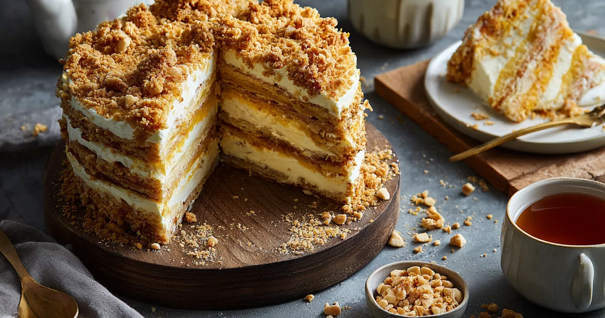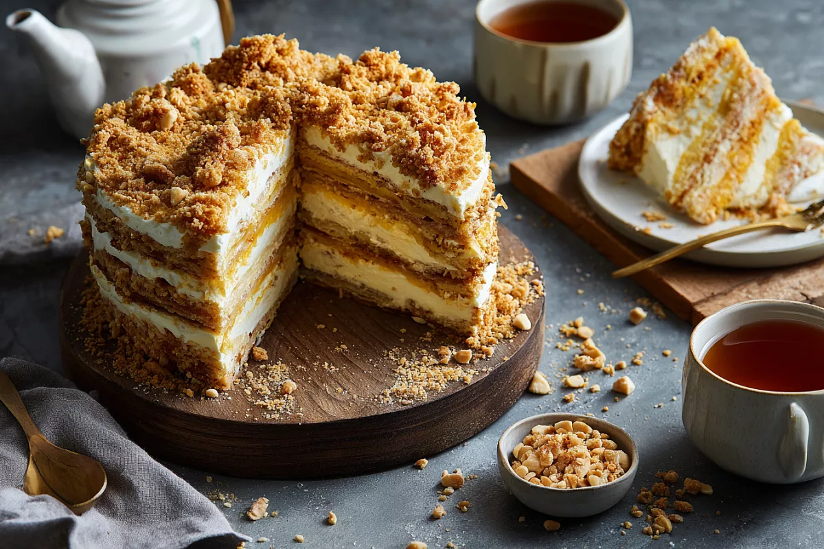 Нежный торт с песочными коржами и кремом из сметаны и сгущёнки — идеально для семейного чаепития!