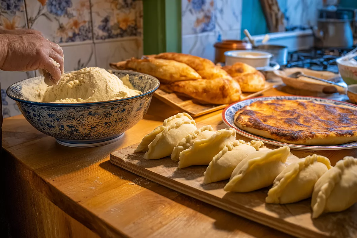Дина готовит постную начинку из 600 г картофельного пюре, смешанного с жареным луком и грибами, приправленных солью и перцем. Начинка должна быть комнатной температуры, чтобы не повредить тесто. Можно добавить зелень или использовать другие начинки по вкусу.