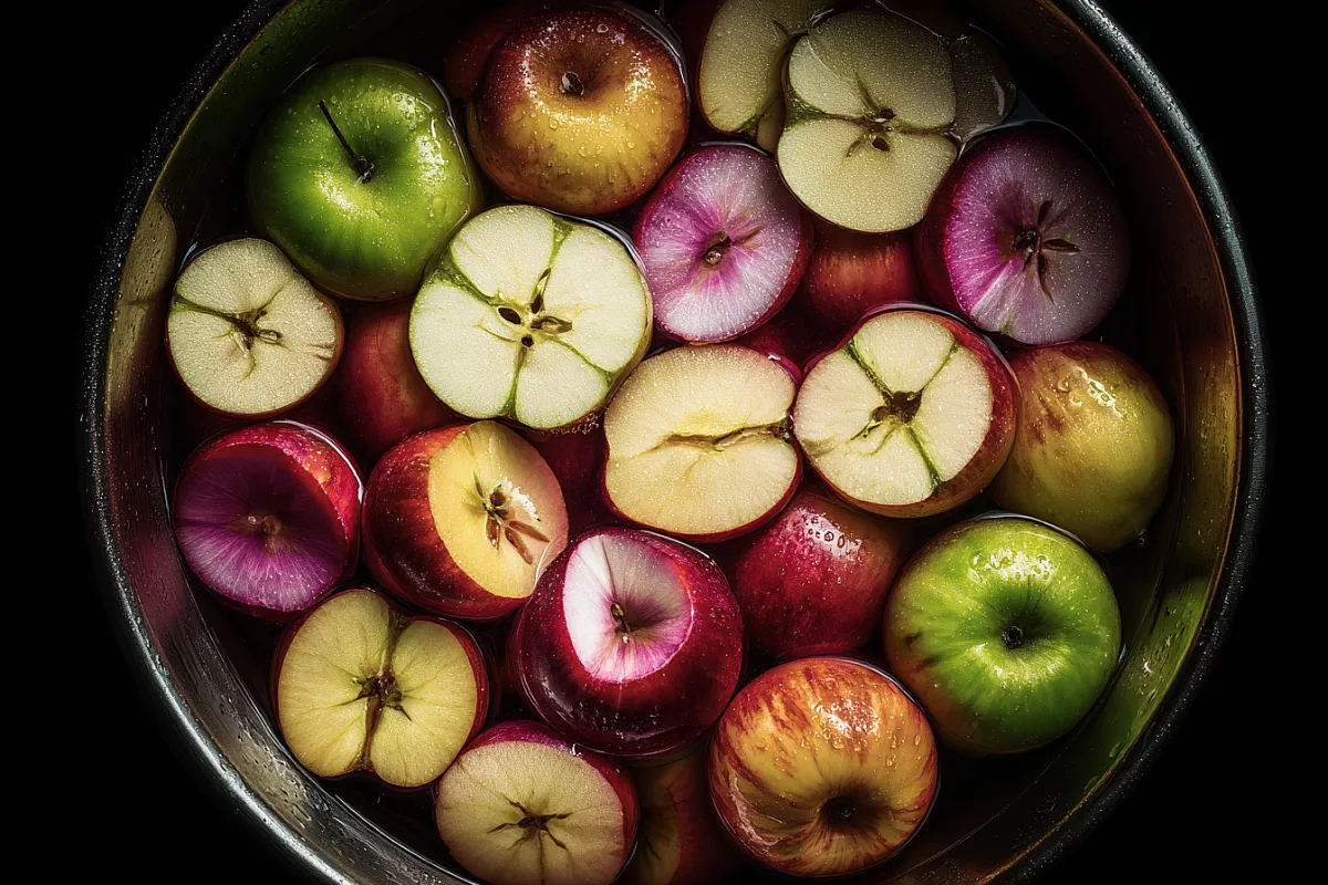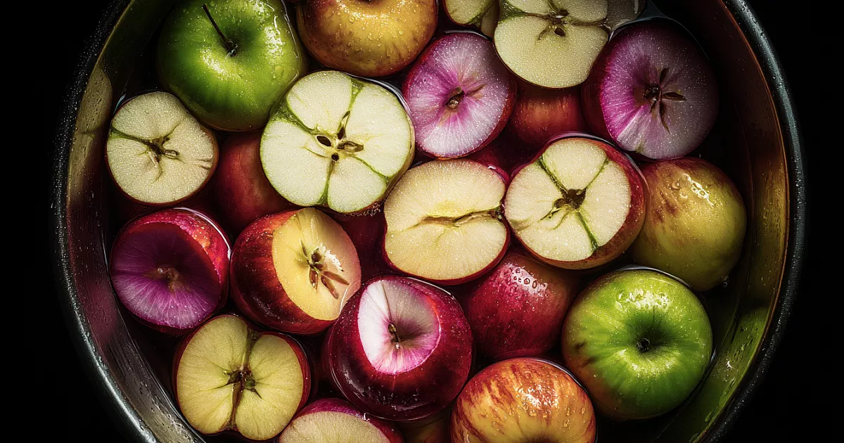 Берут твёрдые, сочные сорта. Яблоки моют, разрезают на четвертинки, вычищают сердцевину, срезают повреждения и режут кубиками по 1–1,5 см. Для 2 кг яблок всего 300 г сахара. Кислые плоды можно сбалансировать ½ ч. л. лимонной кислоты или 1 ст. л. сока лимона — это держит цвет и добавляет яркости.