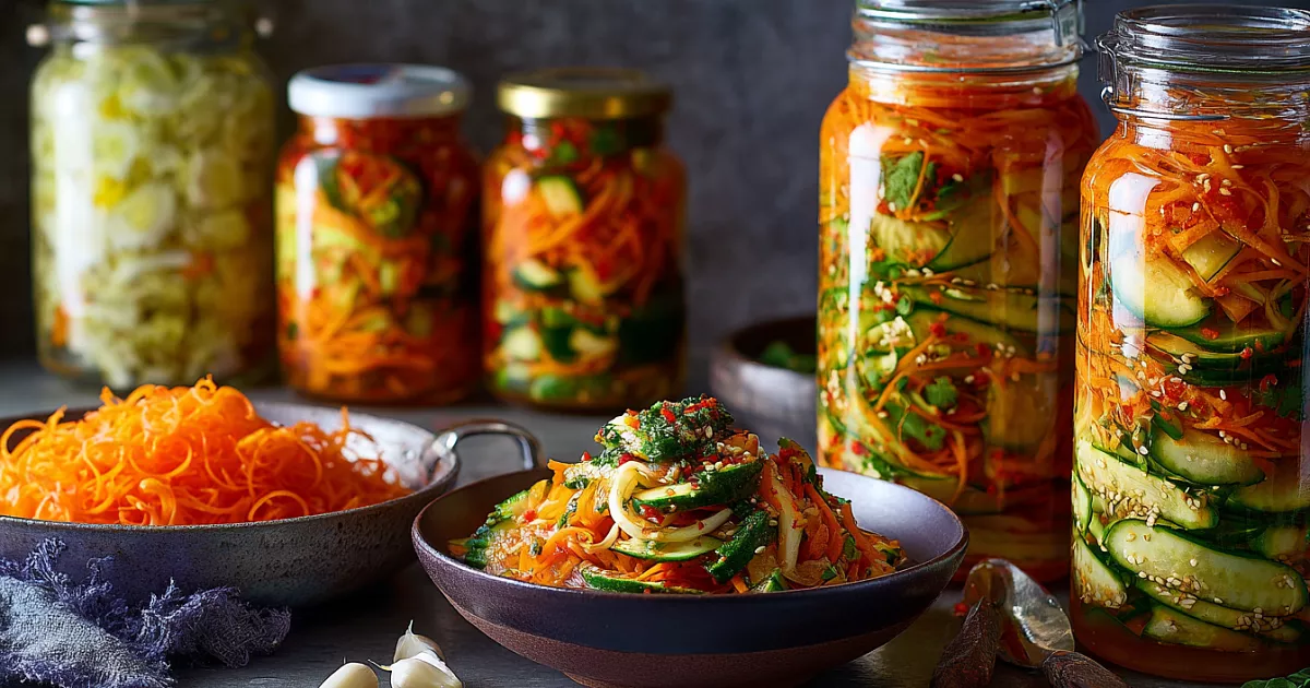 Кабачки по-корейски — это универсальный салат, который подходит к картофелю, мясу, макаронам или праздничному столу. «Натираю кабачки на тёрке для корейской моркови, так же поступаю с морковью, а болгарский перец нарезаю тонкой соломкой. Измельчаю пучок базилика и соединяю всё в большой миске», — рассказывает автор рецепта. К овощам добавляют немного острого перца по вкусу, сахар, соль, уксус, кориандр, паприку и измельчённый чеснок. Растительное масло раскаляют и заливают им специи, чтобы усилить аромат, затем всё перемешивают и оставляют мариноваться на 3 часа.