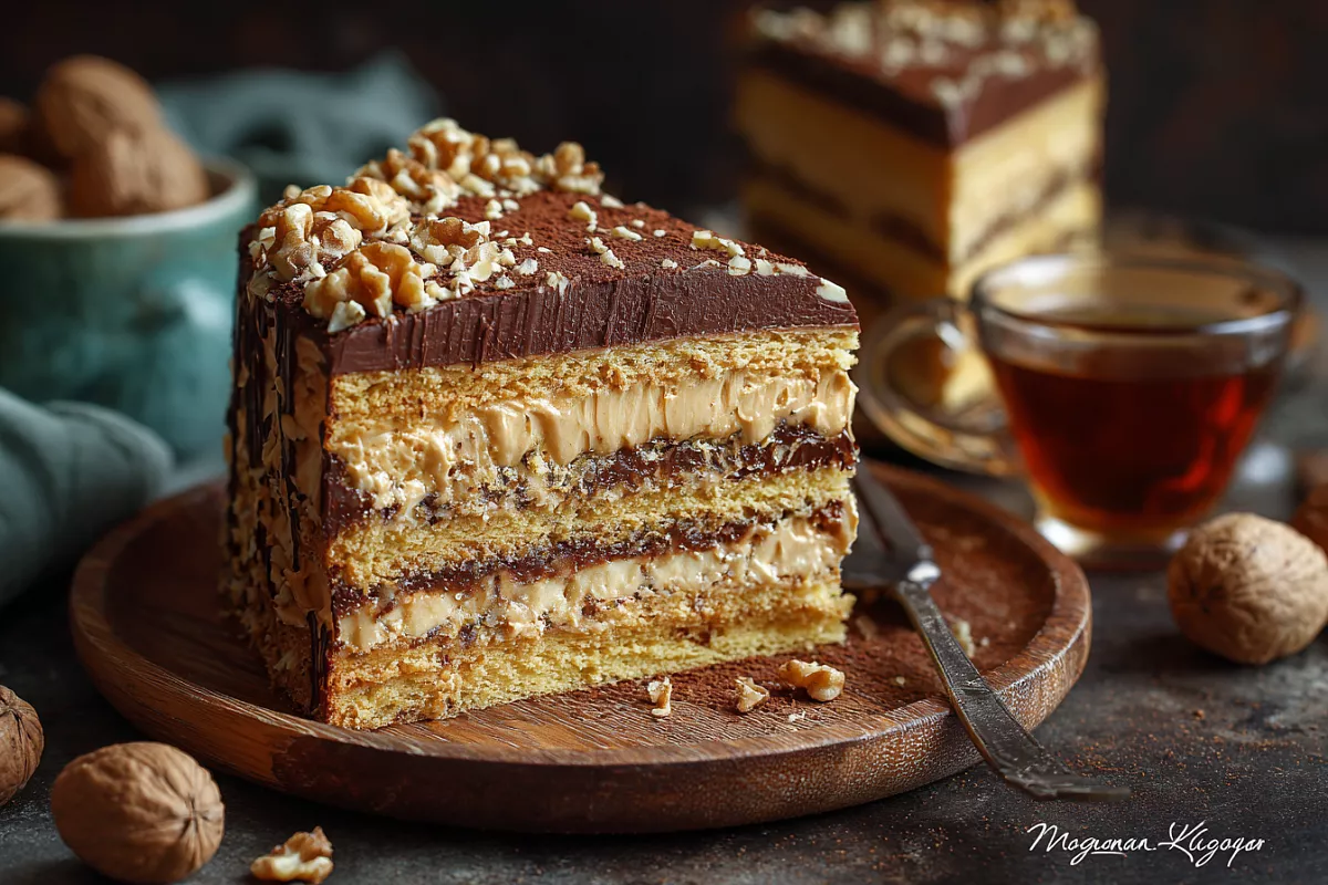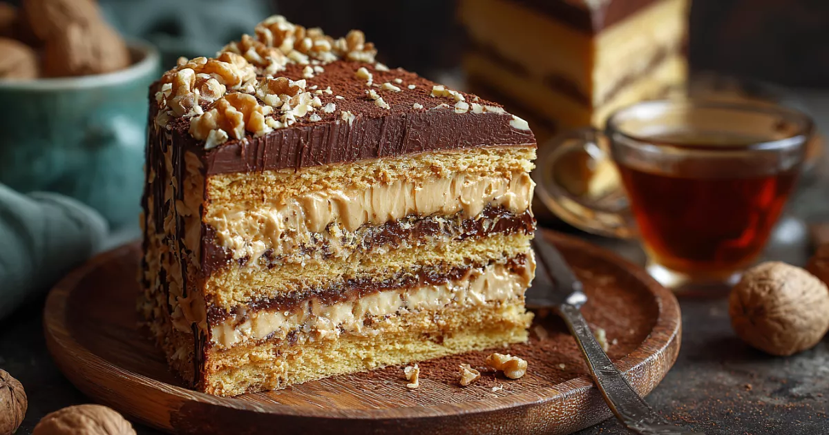 Для светлого коржа: 3 яйца, 150 г сахара, 1 ч. л. ванильного сахара, 2 ст. л. растительного масла, 2 ст. л. варёной сгущёнки, 120 г муки, 1 ч. л. разрыхлителя. Для тёмного коржа: те же ингредиенты, но замените 1 ст. л. муки на 1 ст. л. тёмного какао (можно чуть больше). Для крема: 200 г сливочного масла, 200 г варёной сгущёнки, 1 ч. л. ванильного сахара, 1 ст. л. какао, 1–2 ст. л. коньяка (по желанию, можно заменить ликёром). Для украшения: грецкие орехи, какао.