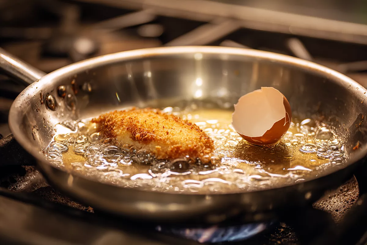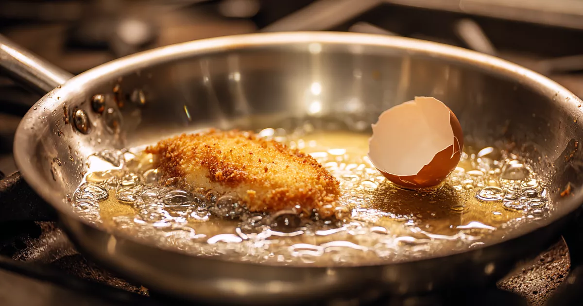 Теперь очередь курицы. Замаринованную грудку обваливаем в сухарях и хорошо прижимаем панировку. В сковороде разогреваем 100 мл масла и — вот секрет — опускаем в него скорлупу яйца. Масло остаётся спокойным и не брызжет. Обжариваем курицу до золотистой корочки с двух сторон и перекладываем на бумажное полотенце.
