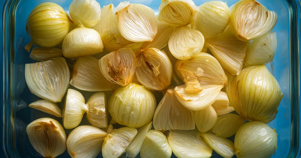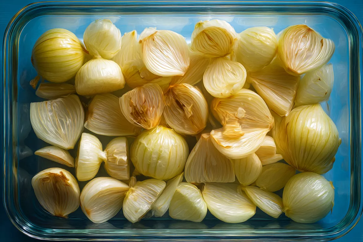 На следующий день лук перекладывают в форму для запекания. Сверху выкладывают две головки чеснока, разрезанные пополам прямо в шелухе. Посыпают сахаром — это придаст лёгкую карамельность. Форма накрывается фольгой и отправляется в духовку при 180 °C на 20 минут. Затем фольгу снимают и запекают ещё около 40 минут.