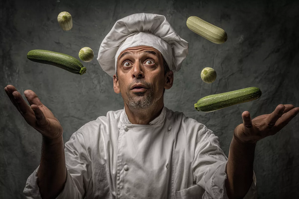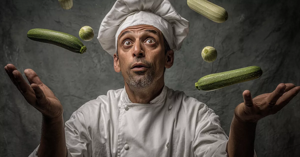 Основой стали кабачки — всегда под рукой в сезон. Их он очистил, нарезал крупными кусками, чтобы внутри осталась лёгкая «аль денте» текстура, а не каша. Сельдерей тоже пошёл в ход: стебли почистил, чтобы убрать жёсткую кожицу, и нарезал мелким кубиком. Помидор обжёг горелкой — гораздо быстрее, чем возиться с кипятком ради одной штуки. Чеснока не пожалел: после обжарки его вкус становится мягким и сладковатым, а аромат работает как стимулятор аппетита.