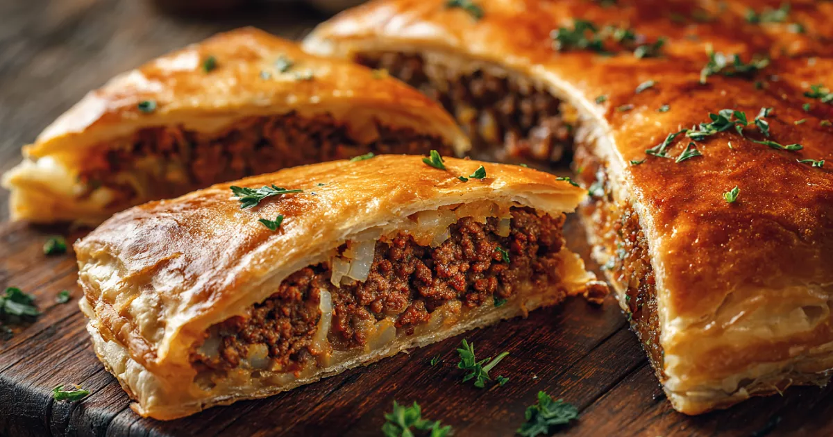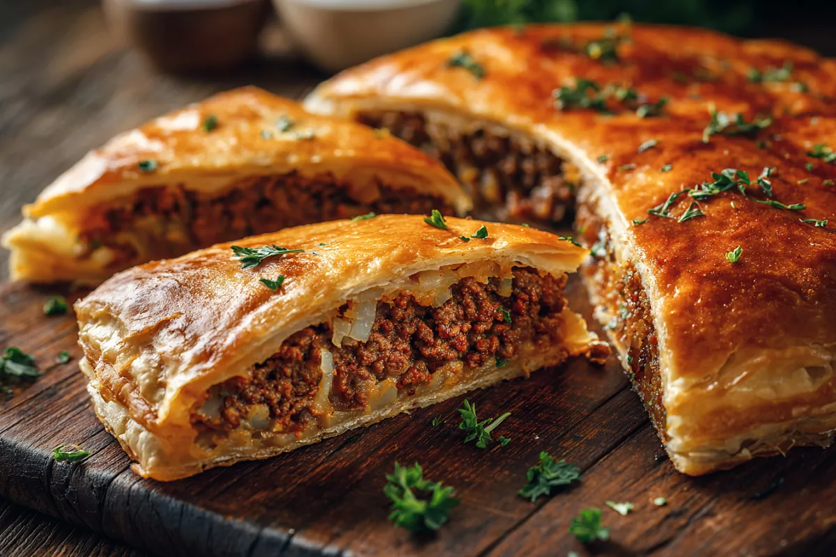 Для начинки: 400 г говяжьего фарша (можно любой), 150 г квашеной капусты (мелко нарезать), 1 луковица (мелкие кубики), 1 ст. л. томатной пасты, зелёный лук и укроп (смешать), соль, чёрный перец, 1 ч. л. сушёного базилика, 2–3 ст. л. растительного масла, 30–40 г сливочного масла. Обжарьте лук на смеси масел до прозрачности, добавьте фарш, готовьте 5 минут на среднем огне без крышки. Всыпьте томатную пасту, соль, перец, базилик, жарьте ещё 5 минут. Добавьте капусту, готовьте 1–2 минуты, затем смешайте с зеленью. Переложите начинку на тарелку для остывания.