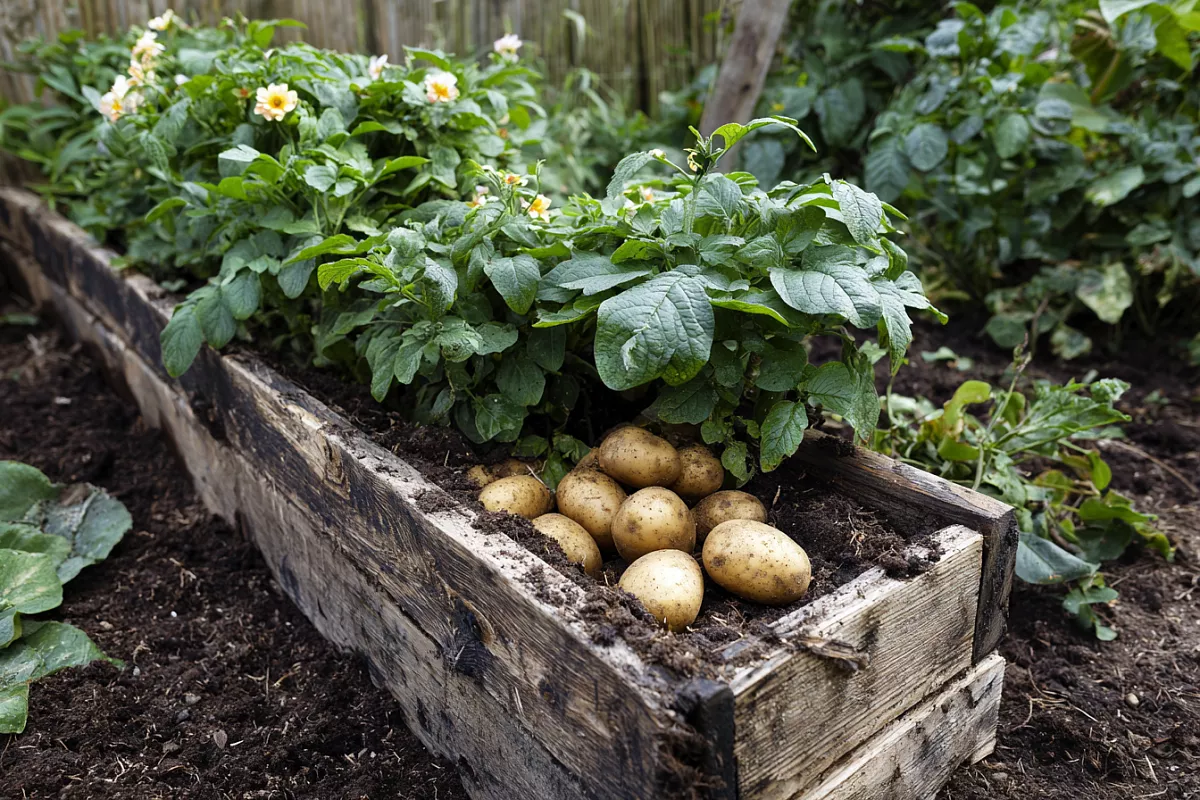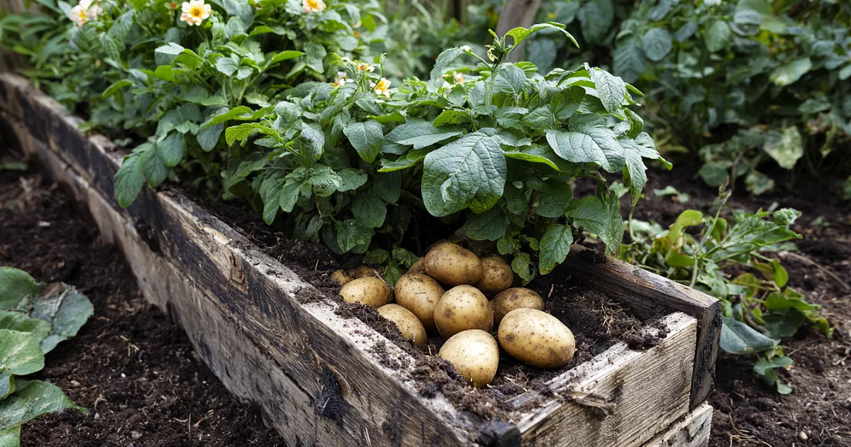 Соберите каркас из досок 30 см высотой. Разложите семенной картофель на почве через 15 см. Насыпьте 10–12 см домашней почвы, добавьте удобрение, полейте. Через 20 дней подсыпьте почву вокруг ростков. Повторяйте каждые 7–8 дней, пока грядка не заполнится. Цветение — сигнал к сбору молодых клубней.
