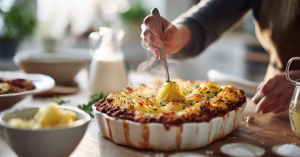Сочная запеканка с говяжьим фаршем, овощами и золотистой картофельной «шапкой» — идеальный семейный ужин с ярким вкусом.