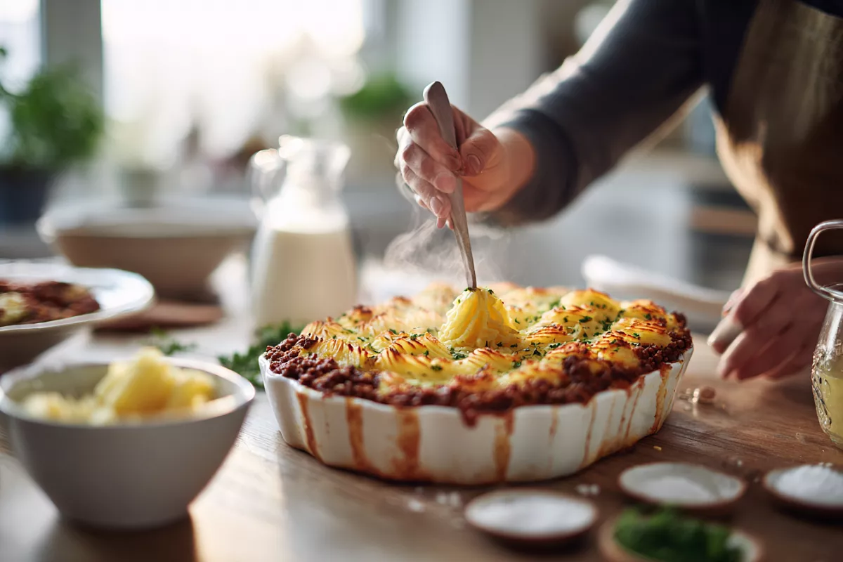 Картофель отваривают до готовности, затем протирают через сито или пресс, чтобы получить нежное пюре. Фарш обжаривают с луком и морковью, добавляют специи, зелень и томаты, слегка подслащенные сахаром, чтобы убрать излишнюю кислоту. На дно формы выкладывают слой картофеля, затем фарш с овощами, сверху оставшийся картофель. Верхний слой смешивают с желтком и формируют узоры с помощью кондитерского мешка.