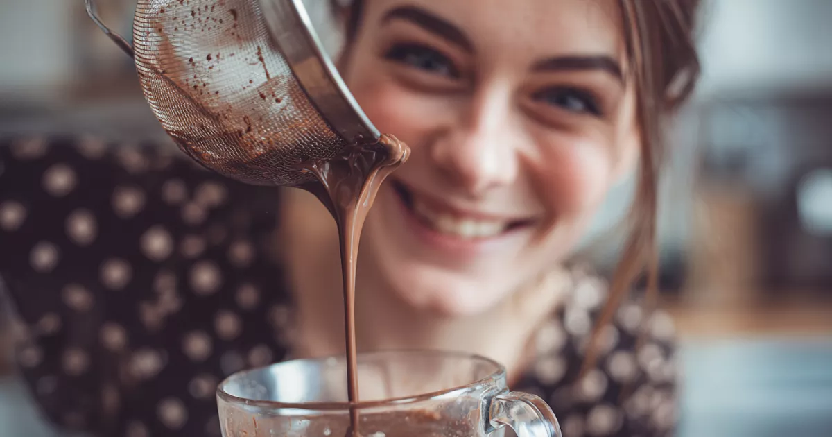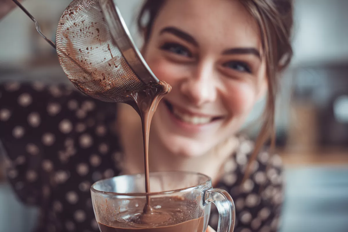 Всыпьте 1 ст. л. качественного какао-порошка и тщательно размешайте до однородности. Процедите через сито, чтобы убрать возможные комочки и лишнюю пену — так структура станет особенно гладкой. Есть приём, который экономит время: процеживайте сразу в чистую посуду, чтобы не переливать напиток дважды.