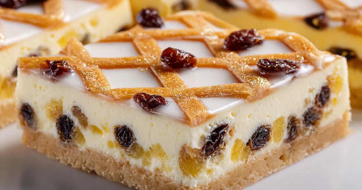 Граммовки и параметры: творог — 500 г; яйца — 4 шт. (4 желтка в массу, 4 белка взбить); сахар — 150 г; ванильный сахар — 10 г; молоко — 120 мл (до 150 мл при сухом твороге); кукурузный крахмал — 60 г; изюм — 100 г; лаваш тонкий — 200 г (¼ на «решётку»); яйцо для смазки — 1 шт.; сметана — 100 г; сахарная пудра — 80 г; форма — 20×30 см; выпечка — 170 °C, 40 мин, верх-низ без конвекции.