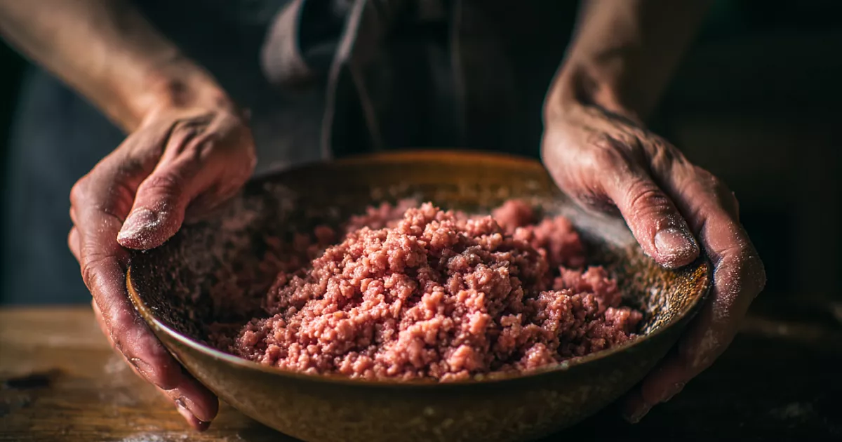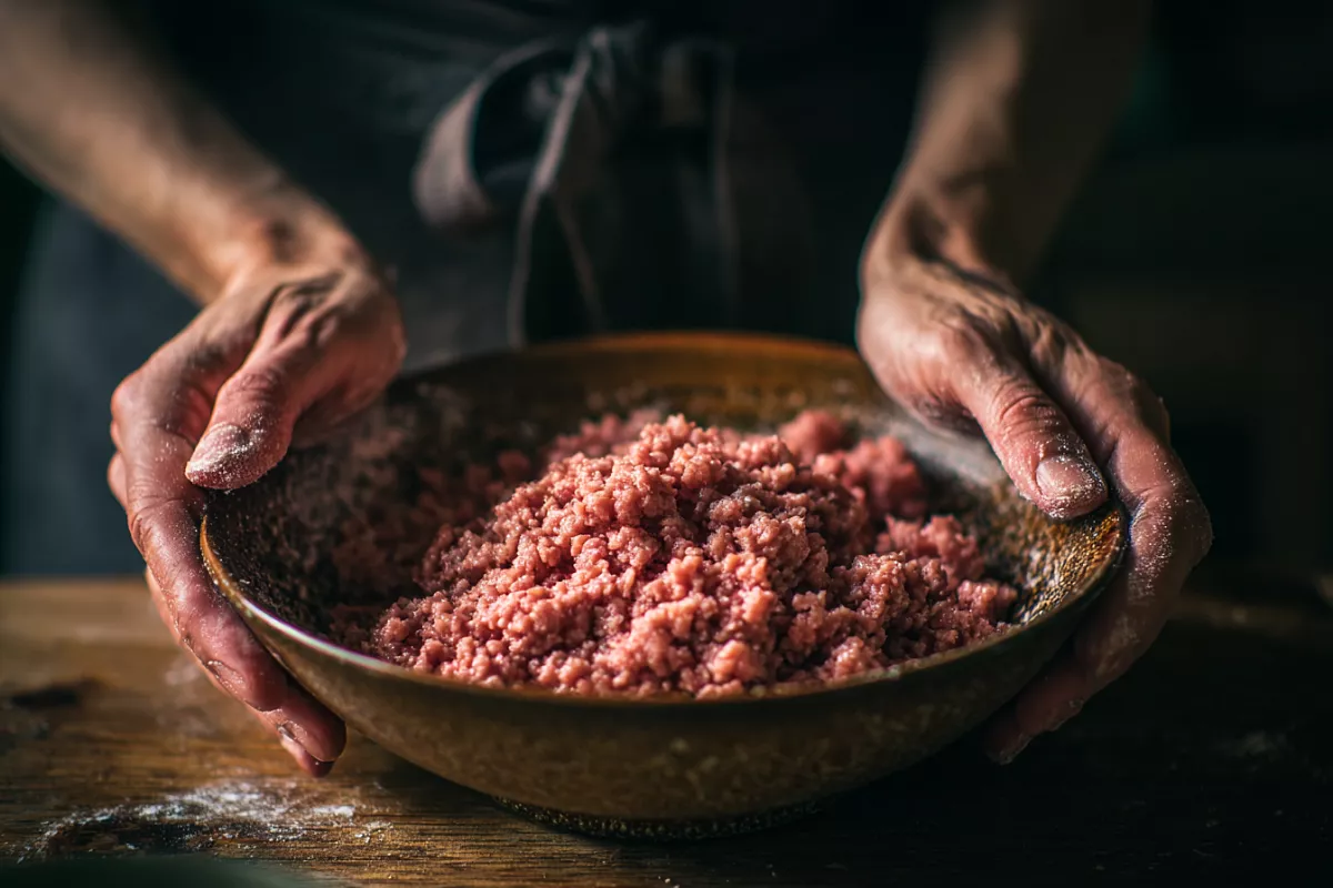 По словам кулинара, на фарш берут говядину 1 кг (можно любой смешанный), лук 150–200 г, при желании чеснок 10–20 г, соль 16–18 г, перец 1–3 г. Для оболочки — мука 200 г и яйца для обвалки.
