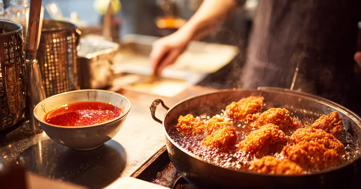 Далее готовят кляр. Сначала курицу перемешивают с мукой прямо в молоке, затем обваливают в сухой муке, чтобы получилась рыхлая «снежная» текстура. Жарка проходит в два этапа: сначала 7 минут при 170 °C до светло-коричневого цвета, затем повторная — всего 1,5–2 минуты. Именно двойная обжарка делает кусочки максимально хрустящими.
