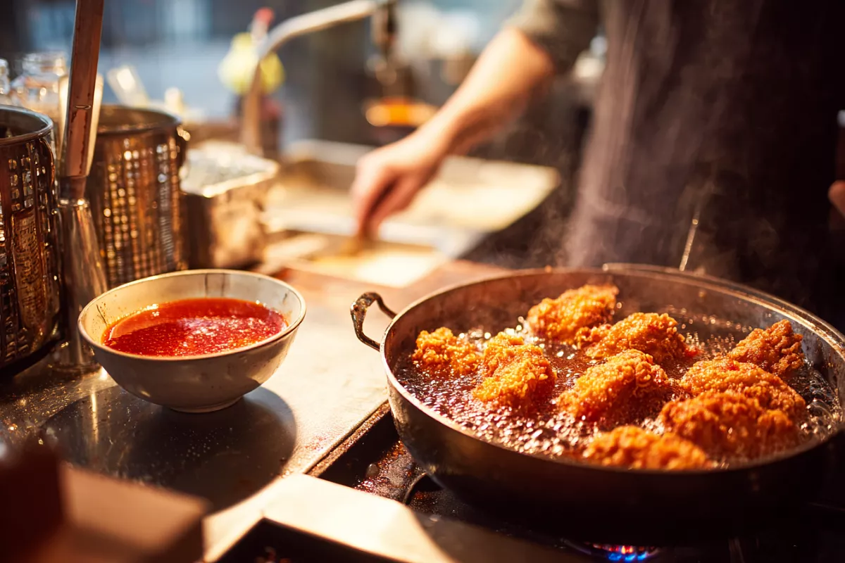 Отдельное внимание уделяется соусу. В его основе — корейская паста кочудян, молотый перец кочукару, соевый соус, кукурузный сироп и кетчуп. Смесь прогревают на сковороде до глянцевой текстуры. Курица либо заливается соусом сверху, сохраняя хруст, либо быстро перемешивается в сковороде для равномерного покрытия.