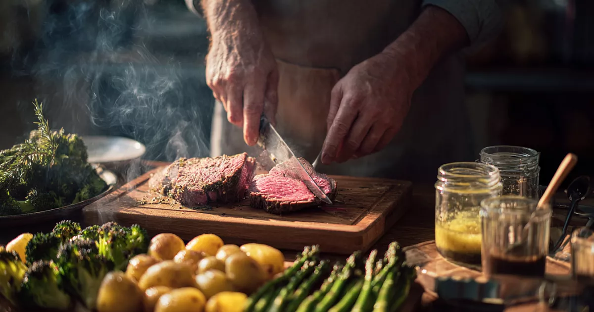 Основное — росбиф из трай-тип (или три-тип, английское название — tri-tip) — это треугольный отруб из верхней части тазобедренной части говядины, который получается мягким и сочным, его можно есть холодным даже на пятый-шестой день. Альтернативы для экономии: толстый край, тонкий край. Курицу берут мякоть бедра для сочности, маринуют, жарят на гриле.