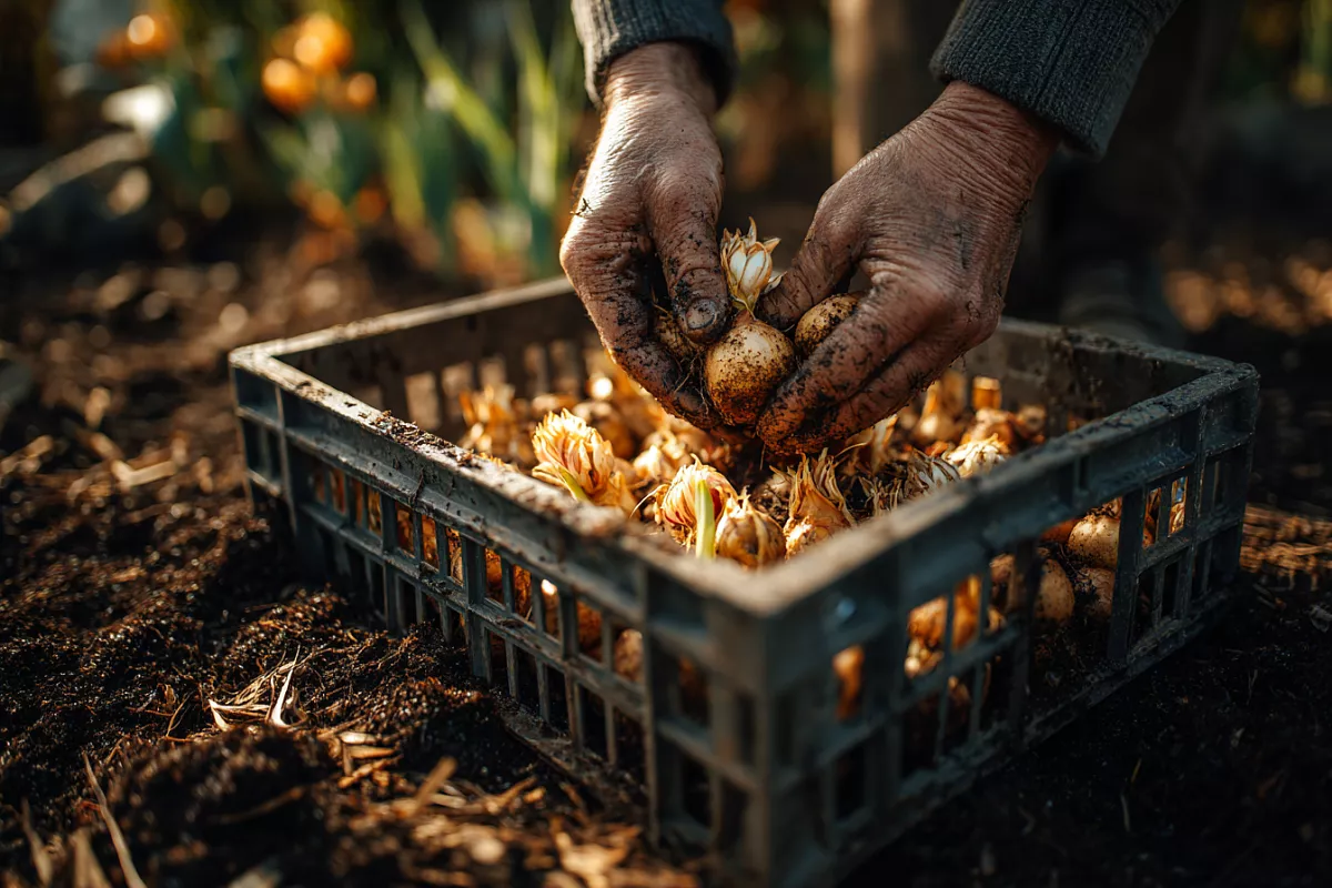 В ящик выкладывают луковицы равномерно, можно рисунком по цветам, присыпают слоем земли. Есть приём, который защищает от грызунов: добавьте опилки, смоченные дёгтем, — их запах отпугивает мышей, а решётчатое дно ящика блокирует доступ снизу. Свежий навоз под луковичные не вносят, лучше использовать перепревший перегной.