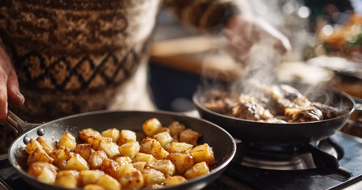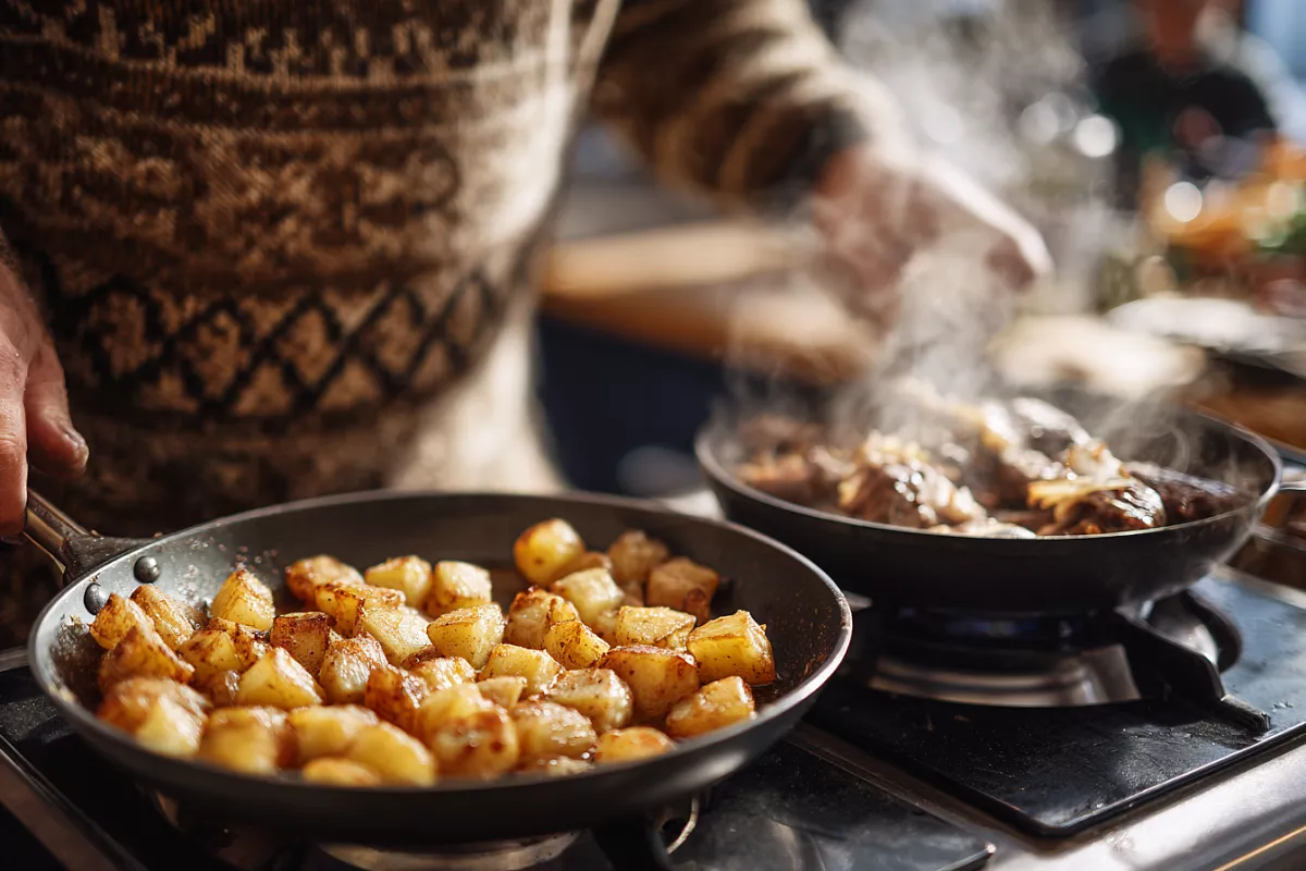 На второй сковороде разогрейте смесь растительного (2 ст. л.) и сливочного (1 ст. л.) масла на сильном огне — картошка впитает вкус и не пригорит. Выложите кубики картофеля, перемешайте и жарьте без крышки 10–12 минут до золотистости со всех сторон. Масло должно кипеть: "Картошку надо обжаривать всё время на сильном огне, чтобы были румяны со всех сторон".