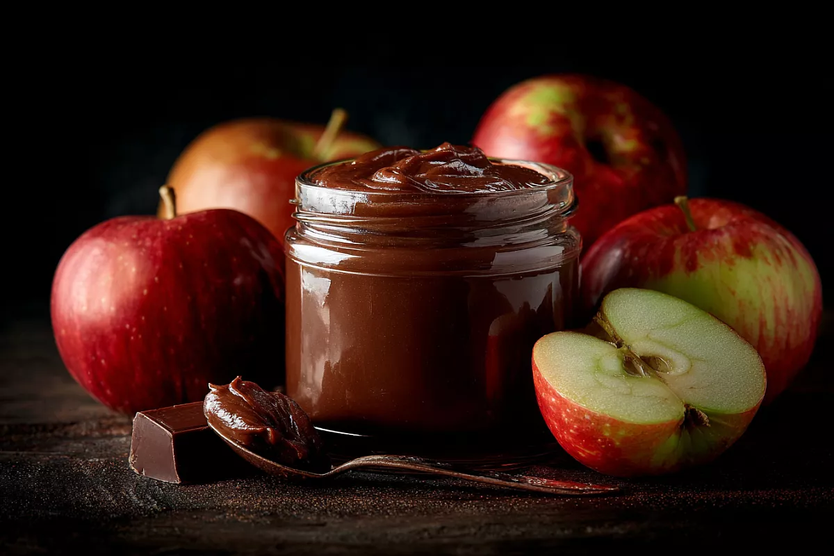 Яблоки, какао, сахар и масло превращаются в густую шоколадную пасту, которую можно использовать как намазку или начинку для выпечки.