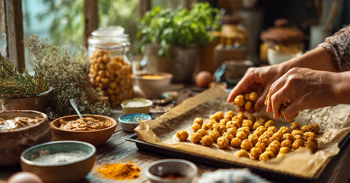 5. Выложите шарики на противень. Выпекайте в духовке при 180 градусах 15 минут или в аэрогриле при 180 градусах 7–8 минут, пока они не станут слегка золотистыми.