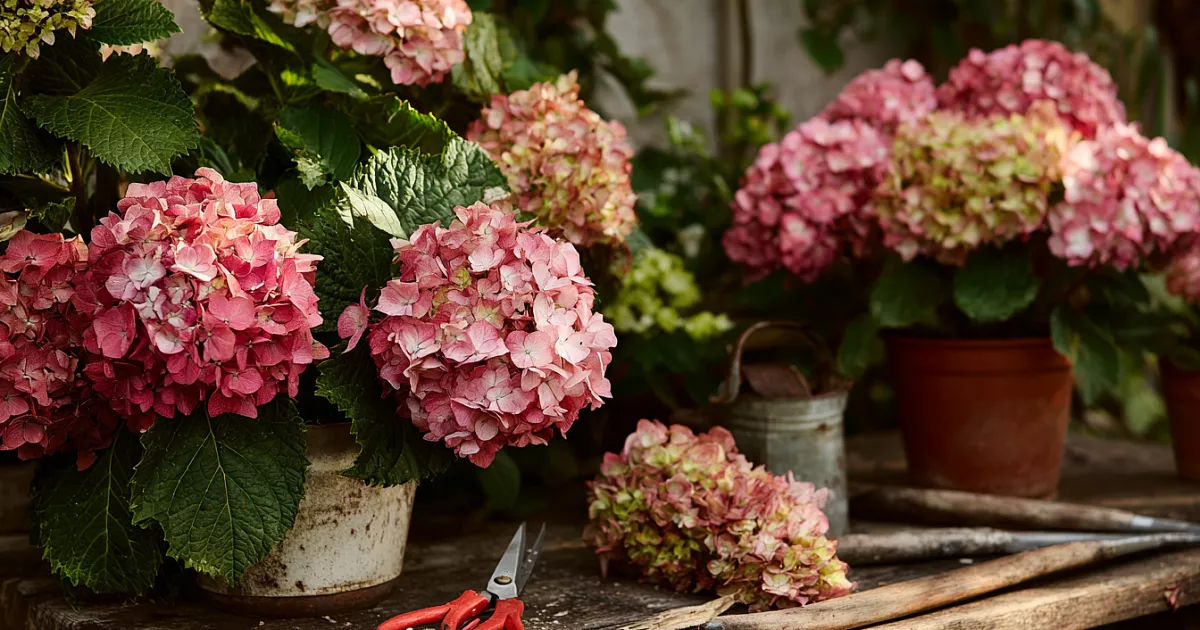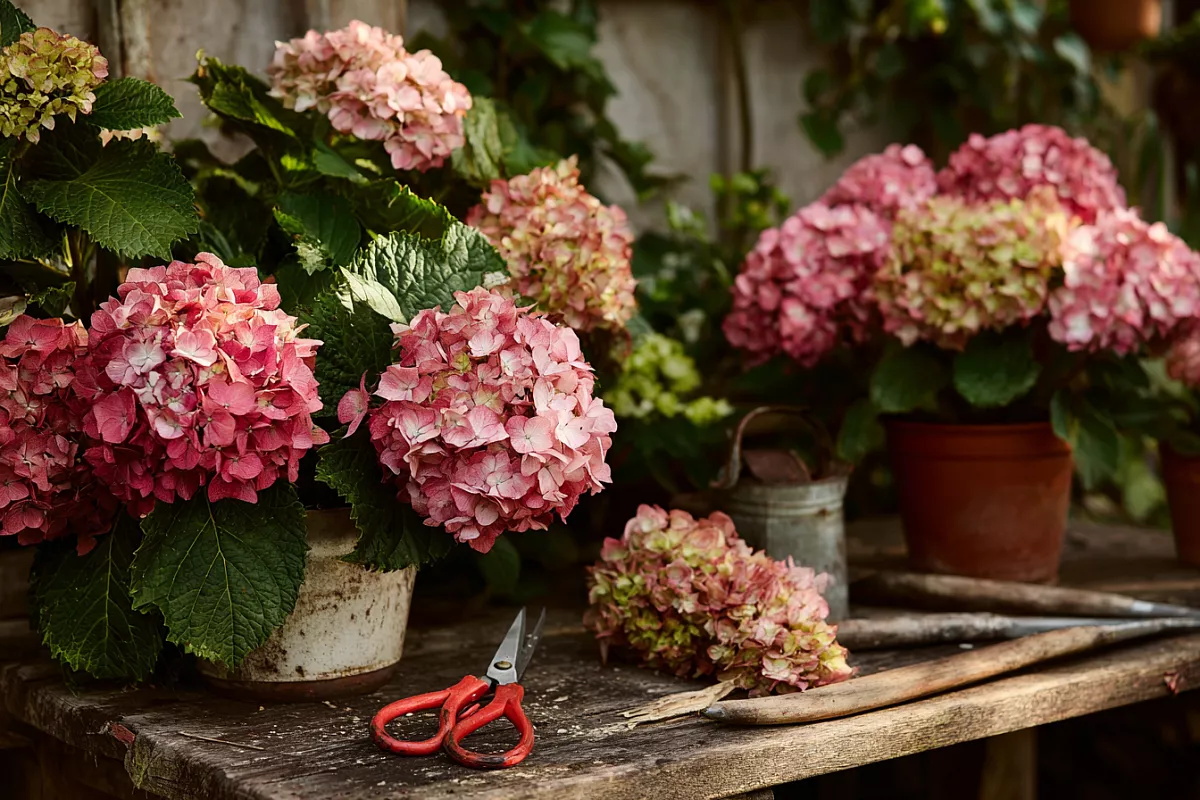 Автор, выращивающая несколько сортов крупнолистной гортензии, делится опытом. Без обрезки в прошлом году её кусты дали лишь по одному соцветию на ветке, а после правильной обрезки — до шести шапок. Например, гортензии в кашпо у входной двери цветут с июня, а отцветшие розовые шапки к сентябрю становятся зелёными, затем ярко-красными, добавляя декоративности. Обрезка включает три подхода:
