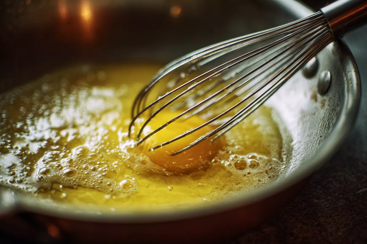 Сковороду разогревают до среднего жара. На стальной посуде омлет получается особенно ароматным, но можно готовить и на антипригарной. Масло распределяют по поверхности, затем выливают яичную смесь. Первые секунды массу активно перемешивают, словно готовят «болтунью», пока не образуются небольшие мягкие кусочки. Дальше омлет оставляют схватываться и аккуратно формируют овальную форму.