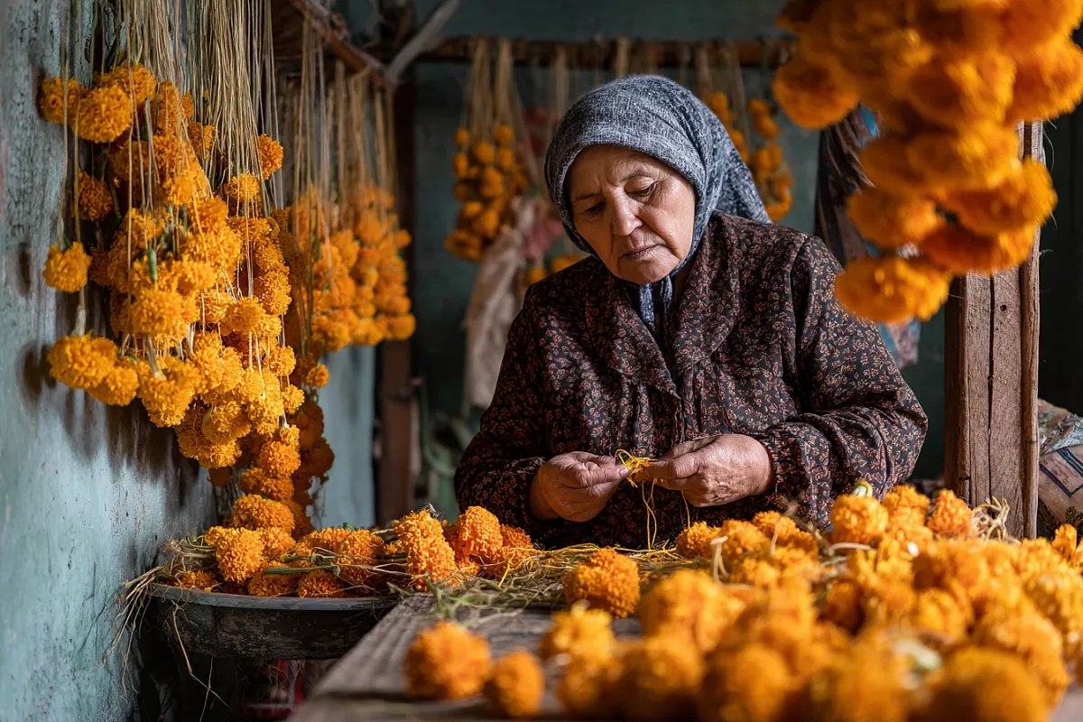 Для приготовления специи используют крупные соцветия ярко-оранжевых сортов. Цветки собирают полностью, нанизывают на нитку и подвешивают в сухом месте. Так они постепенно высыхают, сохраняя насыщенный цвет и аромат.