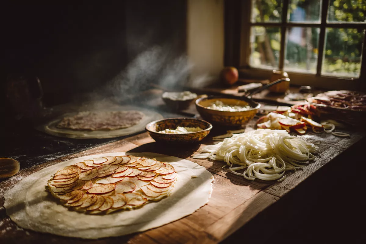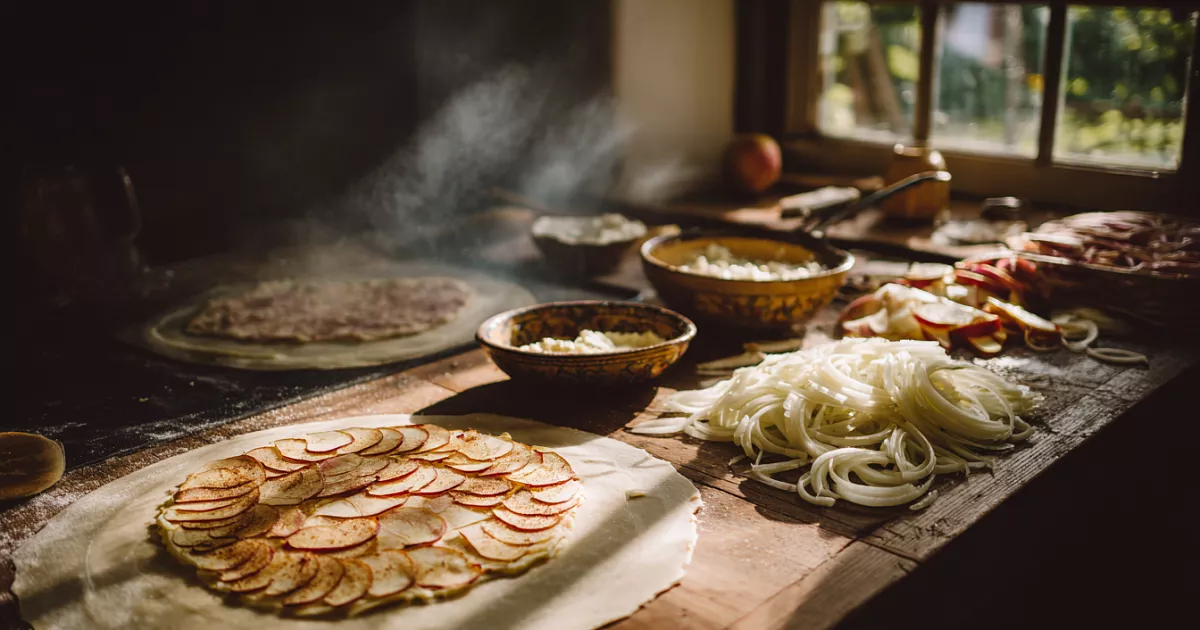 Хотите приготовить легендарный фламмкухен (Tarte Flambée) дома? Эти тонкие, хрустящие пироги без дрожжей с мясной и яблочной начинкой готовятся за 5 минут и покоряют своим вкусом