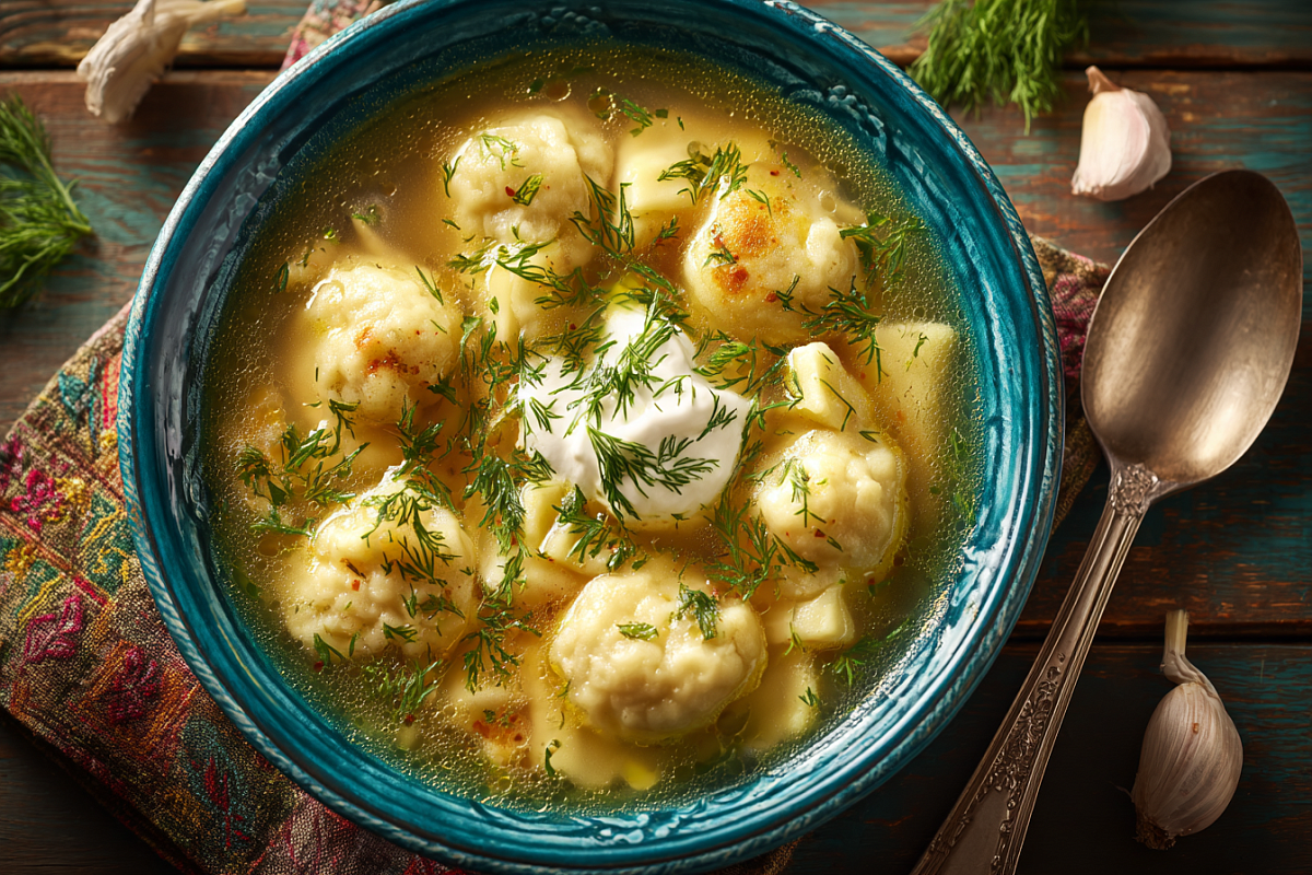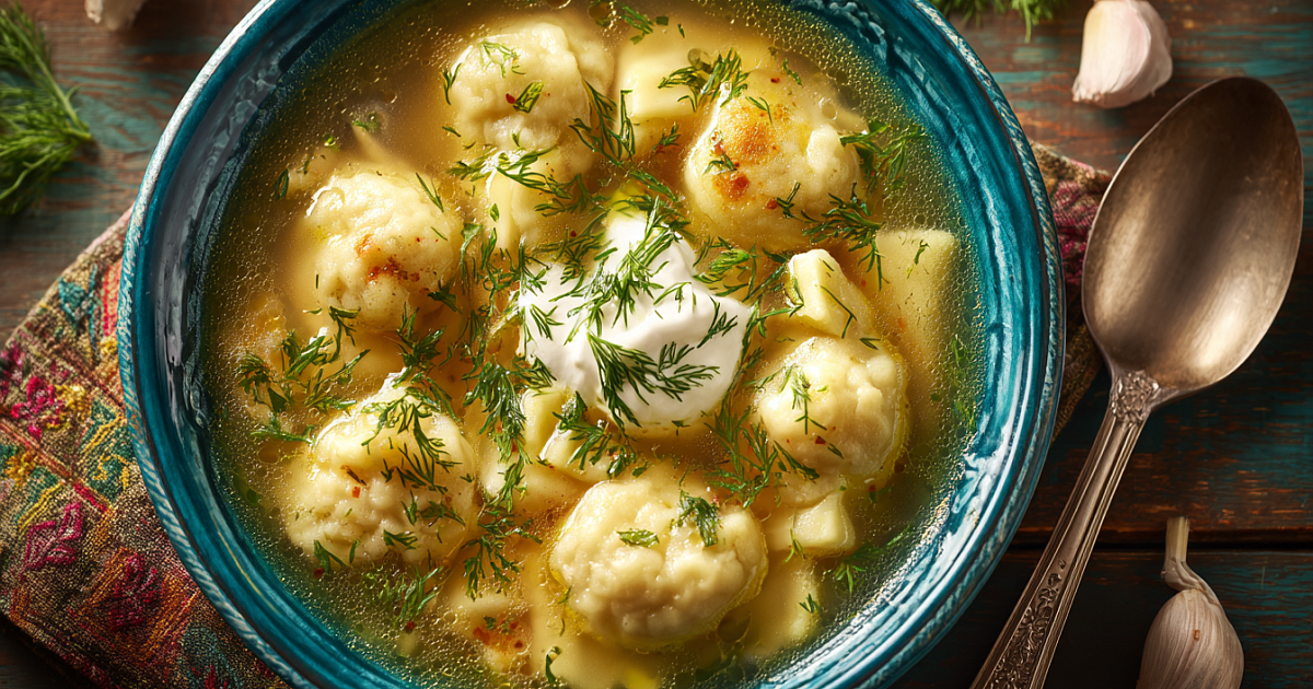 В финале добавляется свежая зелень — петрушка и укроп. Суп получается густым: щедрые куски картофеля, сочное куриное мясо и необычные галушки, напоминающие маленькие чесночные пампушки.