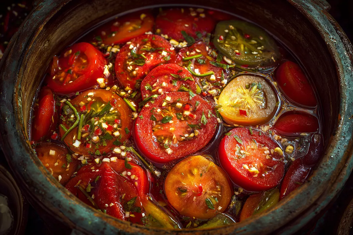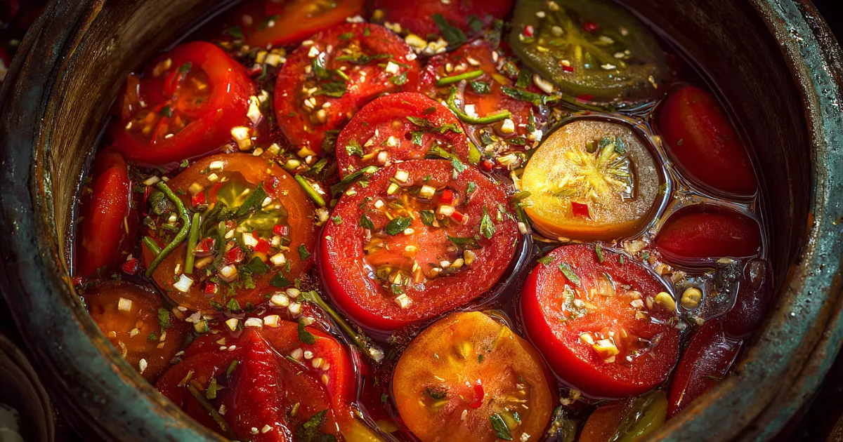 Бурые помидоры в этом рецепте приобретают богатый вкус благодаря маринаду из болгарского перца, чили и трав. Такой способ консервации сохраняет их плотность и делает закуску универсальной — она подходит как гарнир к мясу или самостоятельное блюдо. Это традиционная закуска, популярная для застолий.