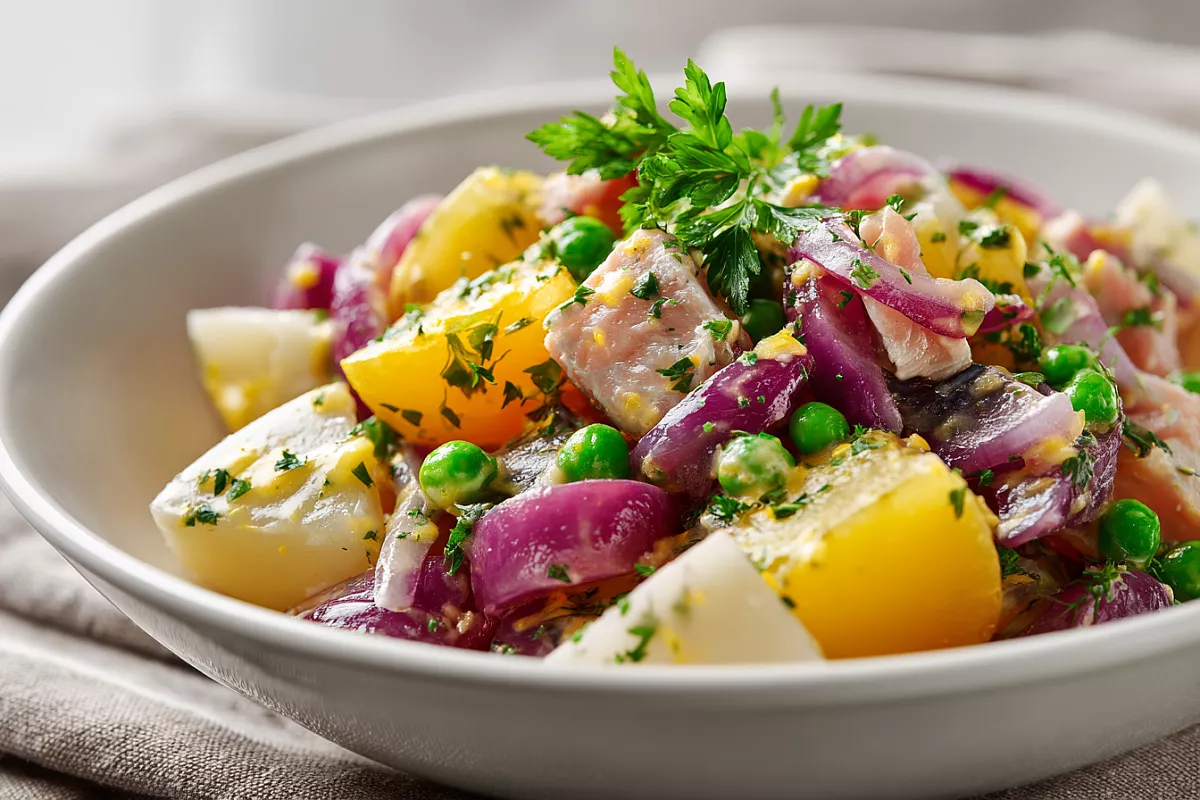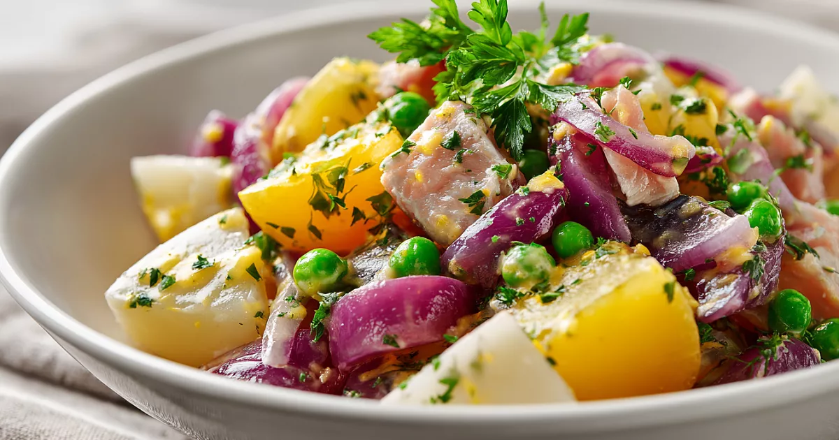Этот салат выделяется сочетанием маринованного лука с картофелем, которое придаёт блюду необычную свежесть. Горчичная эмульсия добавляет нежную остроту, а зелёный горошек — текстуру. Такой рецепт идеален для быстрого ужина или как закуска.