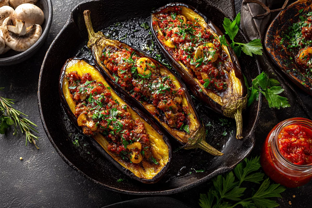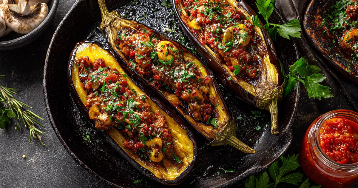 Фаршированные баклажаны с мясом и овощами — сочное, ароматное блюдо, которое можно приготовить на сковороде или в духовке за 30 минут.