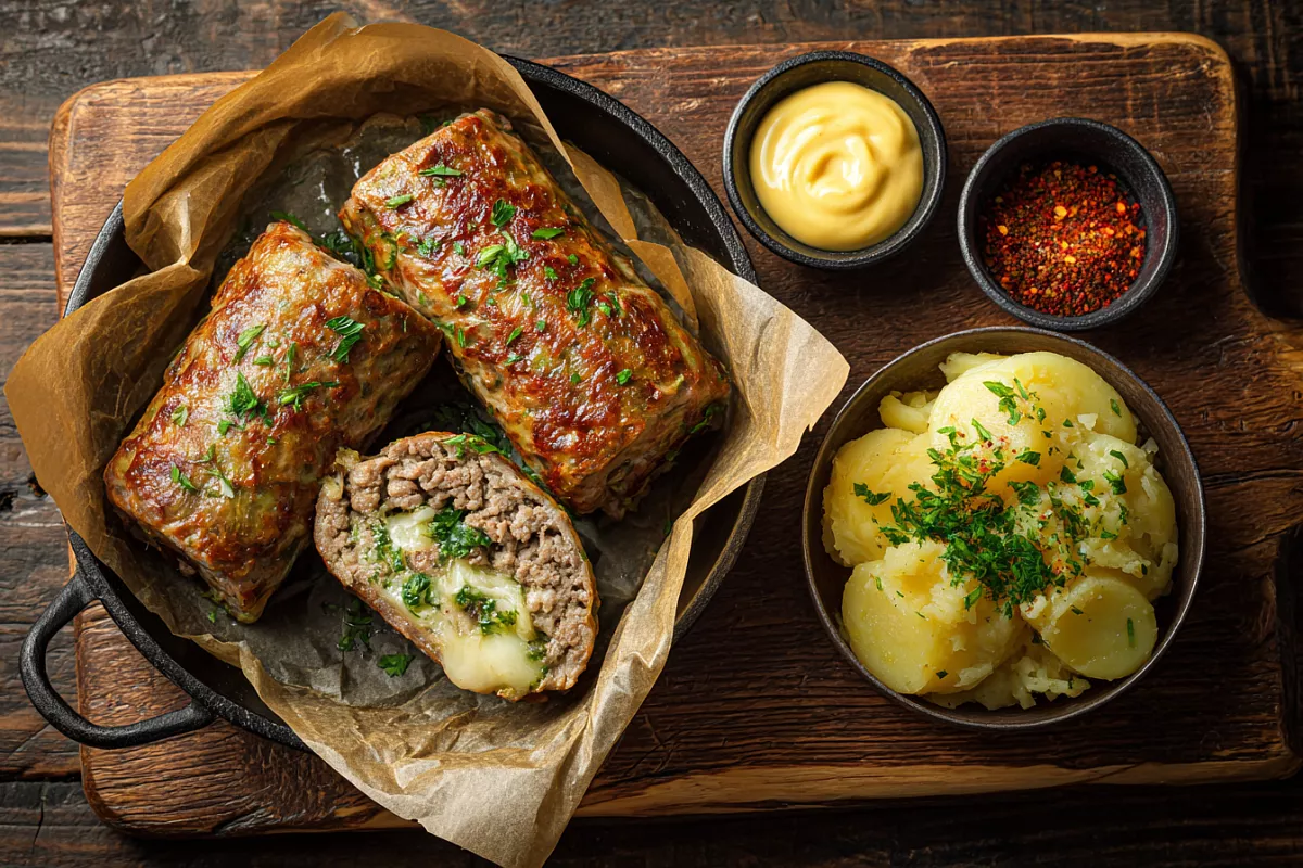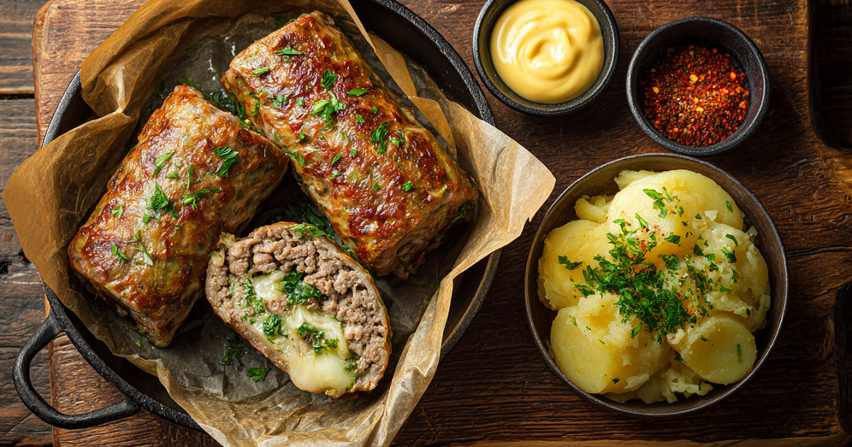 Этот мясной рулет сочетает нежный фарш с картофелем и ароматной начинкой из сыра, приготовленный без масла в пергаменте. Простота рецепта и подача с горчицей делают его идеальным для быстрого ужина или перекуса.