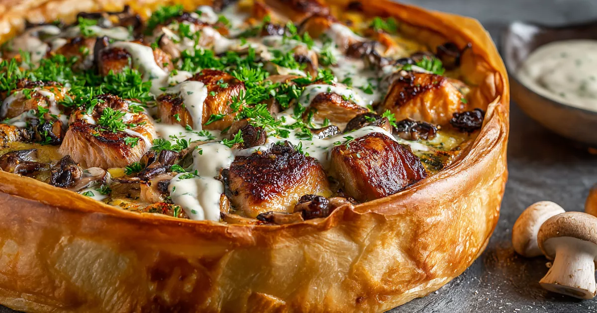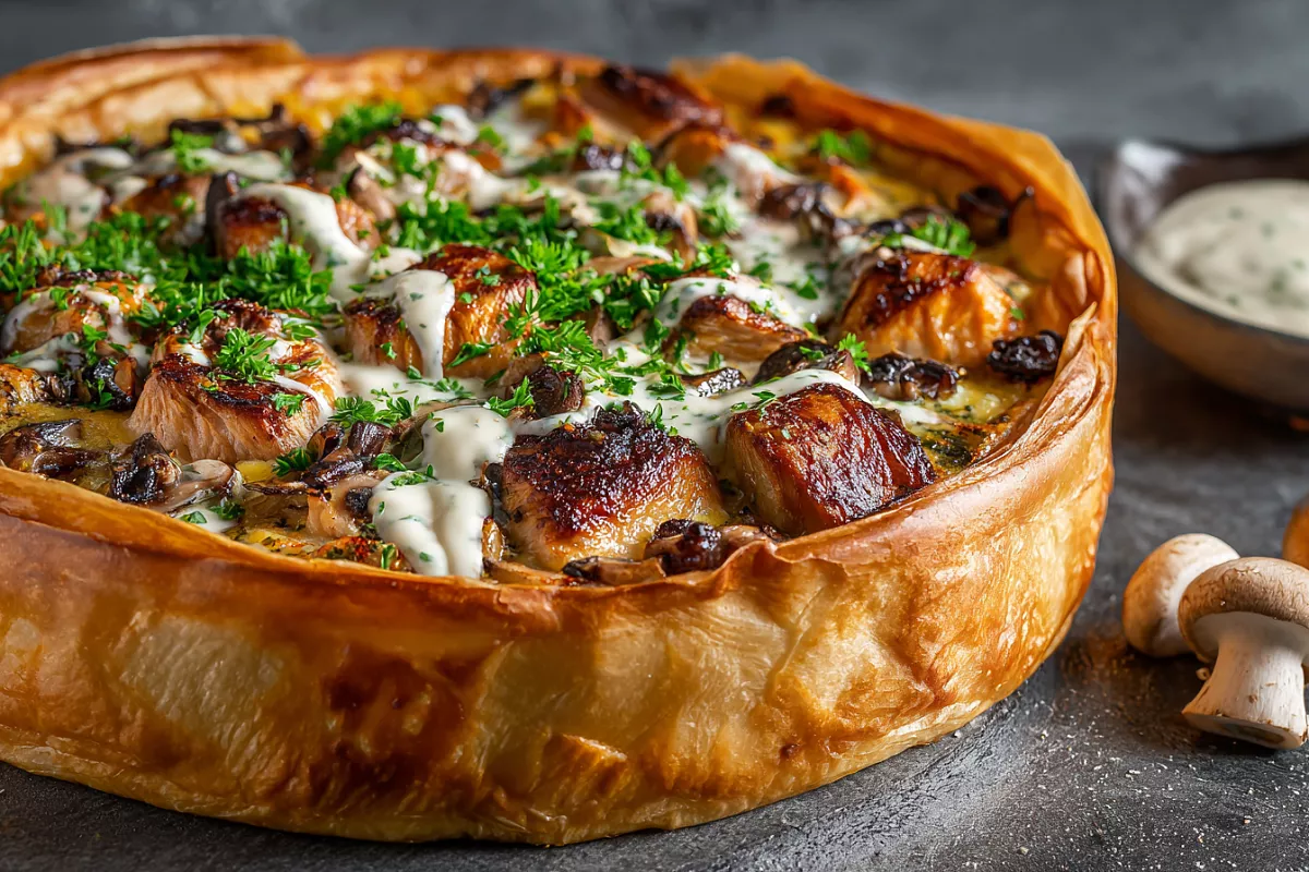 Основа формируется прямо из размятого тёплого картофеля: бортики держат начинку, а вкус напоминает блюдо из печи. Курица обжаривается быстро и только «запечатывается», чтобы дойти в духовке; грибы предварительно выпариваются на сковороде, чтобы пирог не был водянистым. Готовить при 180 градусов: ориентировочно восемнадцать–двадцать минут до румяной корочки.