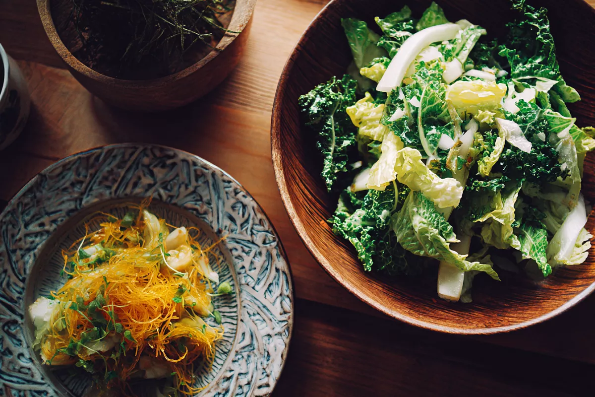Пока лапша доходит, можно приготовить быстрый салат. Молодую капусту нарезают широкими полосками, добавляют тонко шинкованный лук и много зелени. Классическая тройка — кинза, петрушка и укроп. Базилик или реган в таких салатах использовать не советуют: он перебивает вкус. Дополнительно можно положить морковь, сладкий перец для аромата и немного острого перца для пикантности.