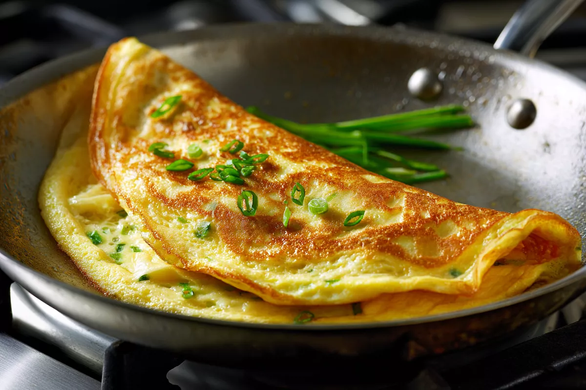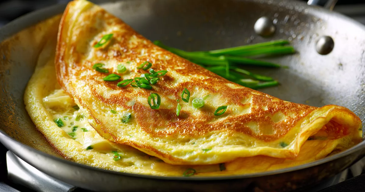 Шаг 4. Для «кремового» варианта: посыпьте зелёным луком или выложите начинку, сложите омлет вдвое (или в три слоя) и прогрейте несколько секунд без переворота — серединка останется нежной. Переложите на тарелку, добавьте перец по вкусу.