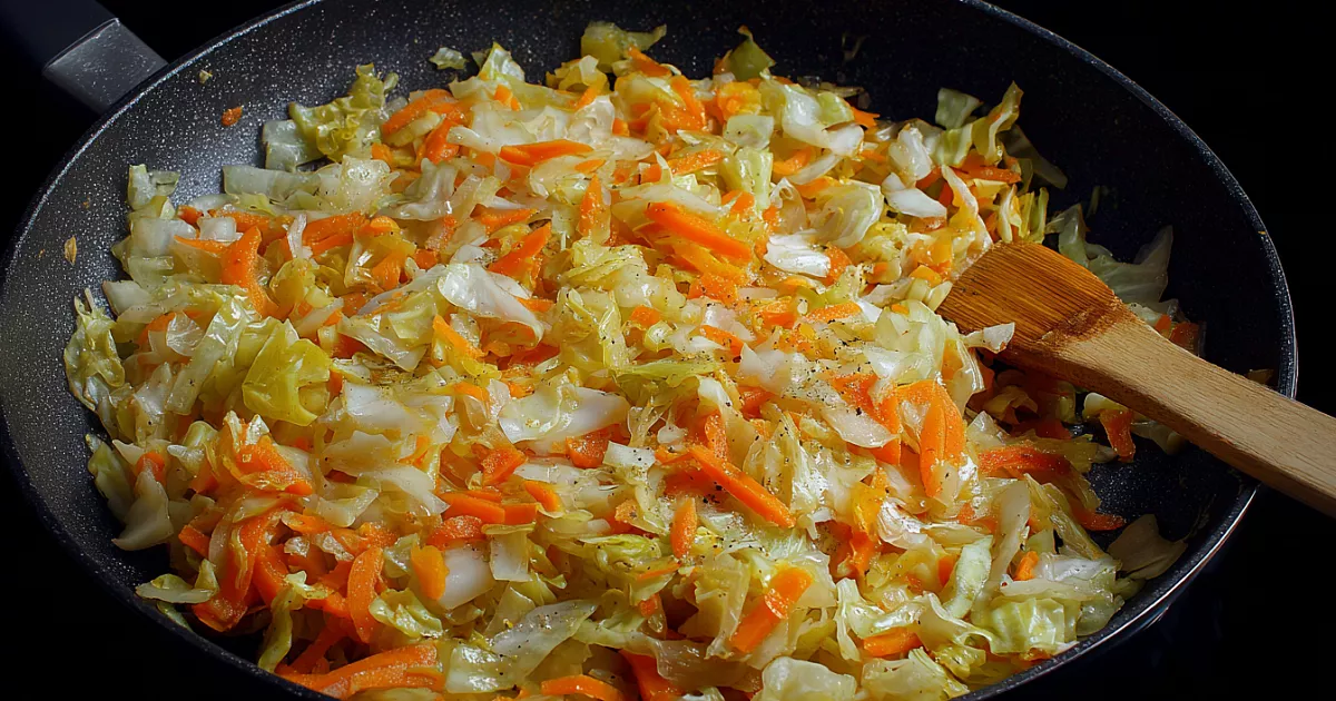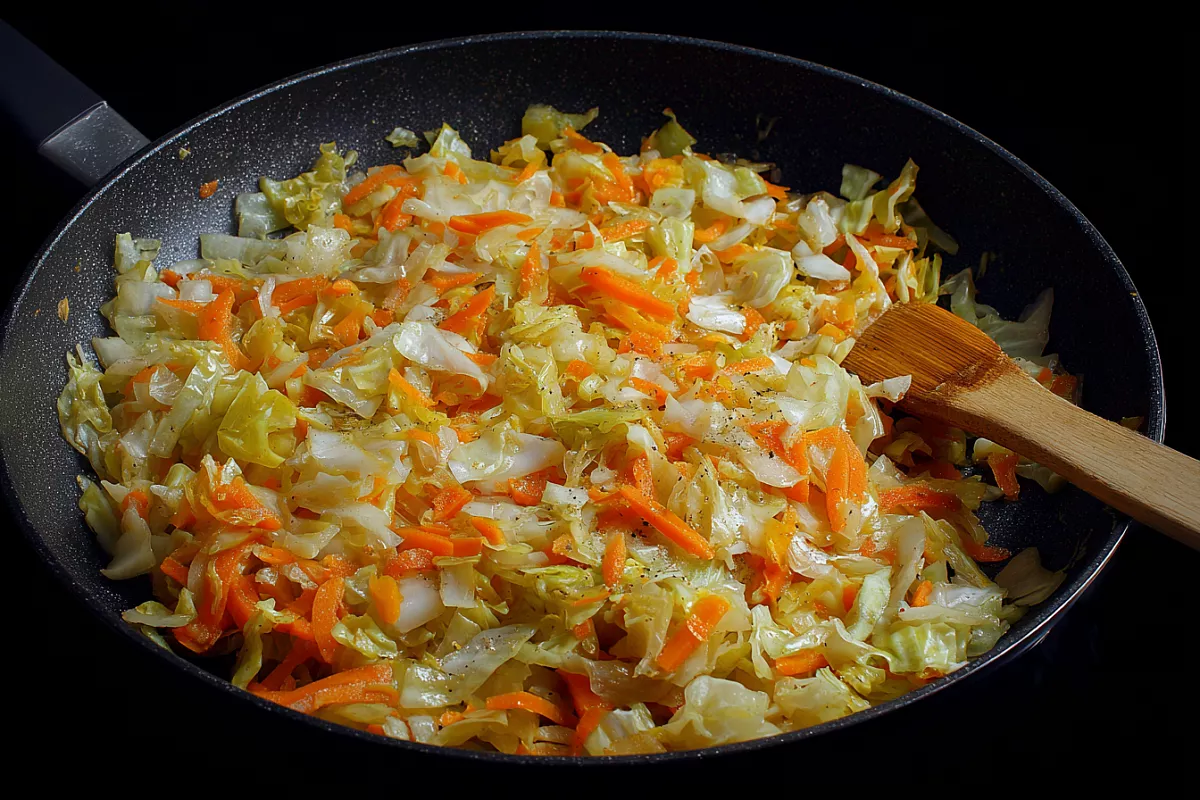 Начинается приготовление с риса: 150 г промывают, варят в 400 мл воды 5 минут до полуготовности и сливают воду. Пока рис варится, подготавливают овощи: луковицу режут кубиками, морковь натирают, 600 г капусты шинкуют тонко. На сковороде с растительным маслом обжаривают лук до полупрозрачности, добавляют морковь и жарят еще 2–3 минуты. Затем выкладывают капусту и тушат, пока она не станет мягкой, при необходимости добавляя немного воды. В конце овощи солят и перчат, чтобы раскрыть их вкус.
