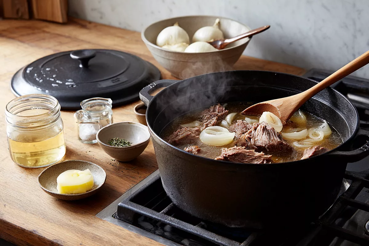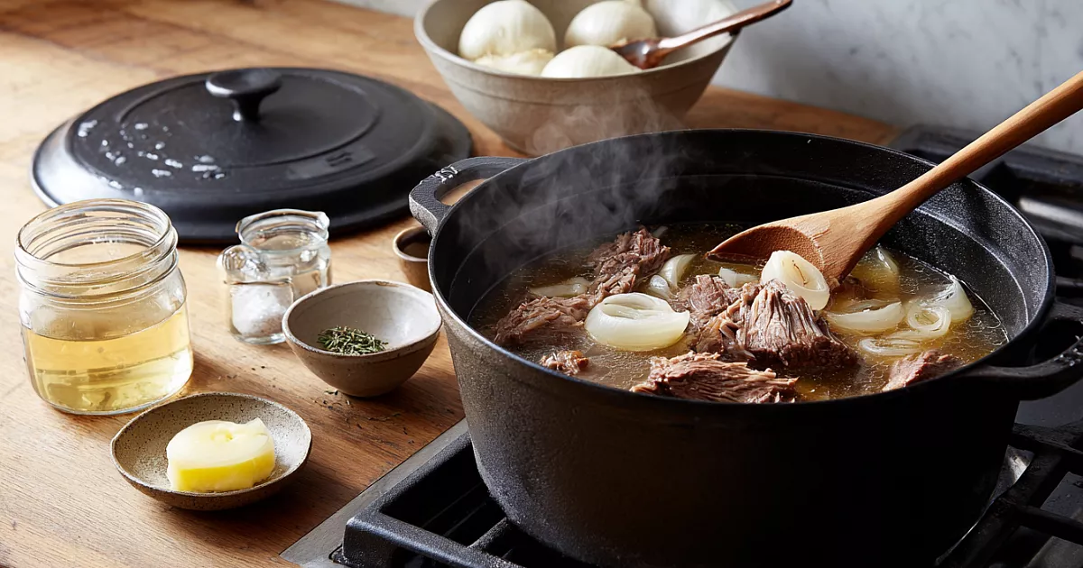 Готовое мясо легко делится на волокна, лук почти растворяется в бульоне. Переложите всё в чистую банку и храните в холодильнике. Для подачи разогрейте порцию вместе с собственным бульоном и соедините с любым гарниром. По желанию можно простерилизовать банки и закатать, чтобы взять с собой в дорогу или на пикник.