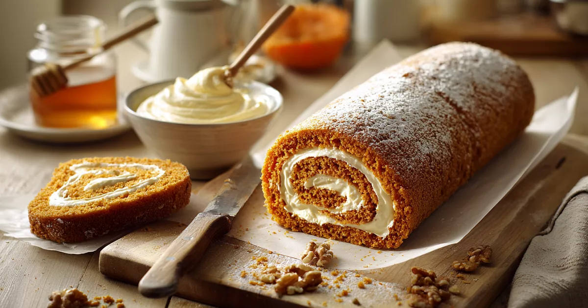 Мягкий тыквенный корж на трёх яйцах сворачивается в рулет с нежным кремом из сливочного сыра, творога и мёда — вкус напоминает булочки «синнабон».