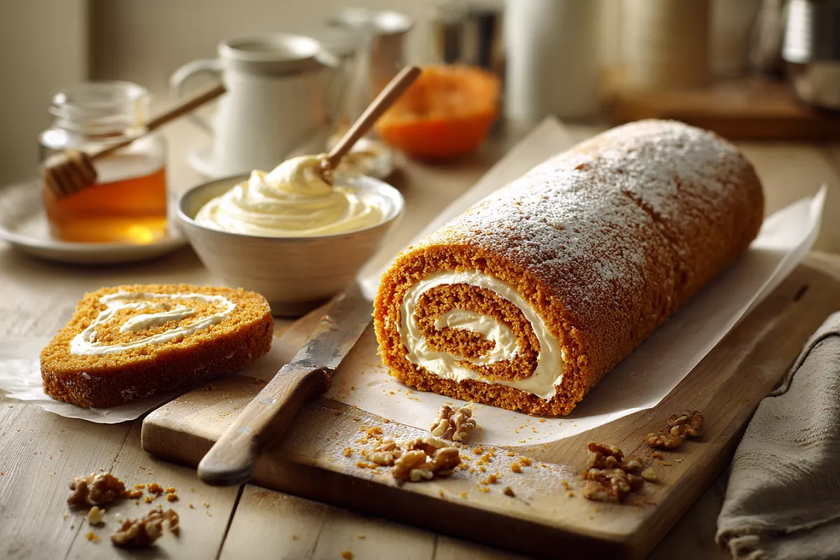 Корж держит форму за счёт яйца, муки и щепотки разрыхлителя, а тёплая мякоть тыквы делает его эластичным и влажным. Остывший до тёплого состояния пласт не крошится и хорошо сворачивается; короткая выдержка в холодильнике закрепляет спираль и облегчает нарезку.