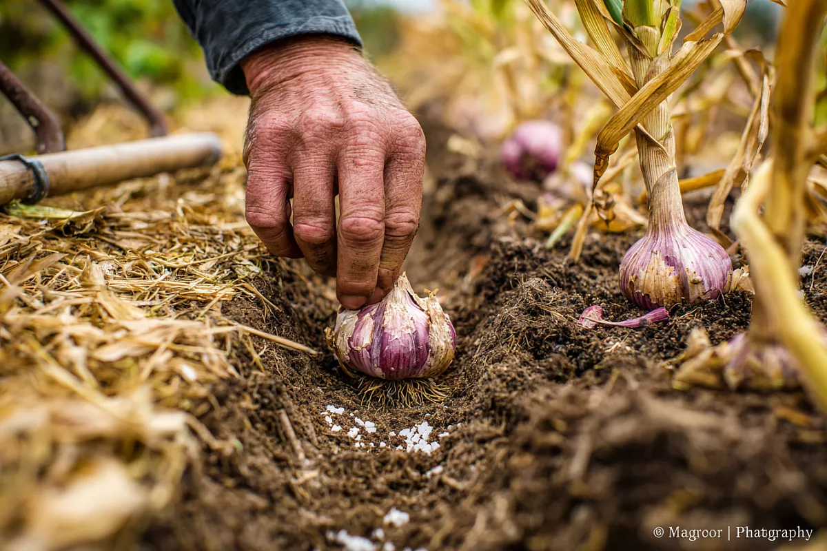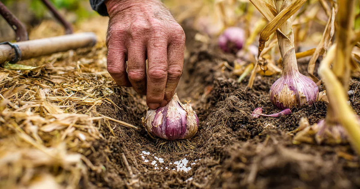 Почву не перекапывают. После уборки культуры поверхность выравнивают и мульчируют свежескошенной травой. Перед посадкой мульчу сгребают к краю, верхний слой слегка рыхлят плоскорезом, разбивают комки и нарезают неглубокие траншеи. Чеснок разделяют на зубки прямо перед посадкой, выбирают крупные и целые в «рубашке». Оголённые зубчики лучше отправить на кухню, так снижается риск повреждений. «Чеснок любит мульчу», поэтому в конце работы её возвращают толстым слоем.