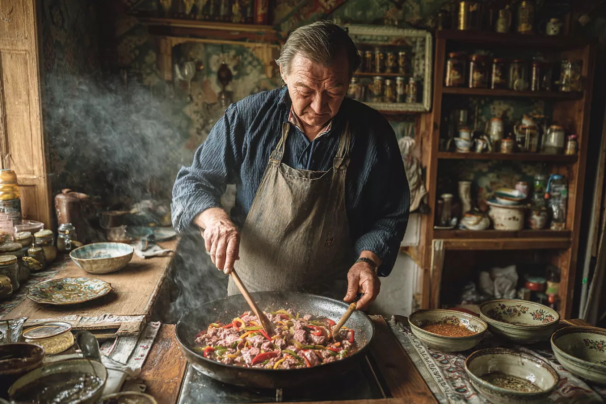 В глубокой сковороде разогреваю масло щедро, почти как для неглубокого фритюра. Жарю мясо частями по 1–1,5 минуты, разделяя ломтики, пока пропадёт красный цвет. Перекладываю на тарелку. В сковороду добавляю при необходимости ещё масла и быстро обжариваю соломку сладкого перца 2 минуты на сильном огне — пусть останется хруст.