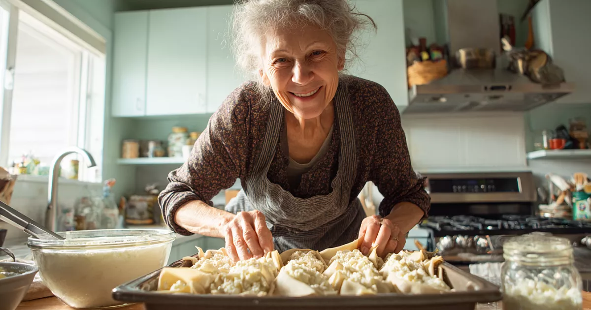 Для золотистого верха достаточно нескольких крошечных пластинок масла поверх складок. Если любите более плотную структуру, не доводите массу до крема, оставьте заметные кусочки творога — они приятно «попадаются» в ломтике.