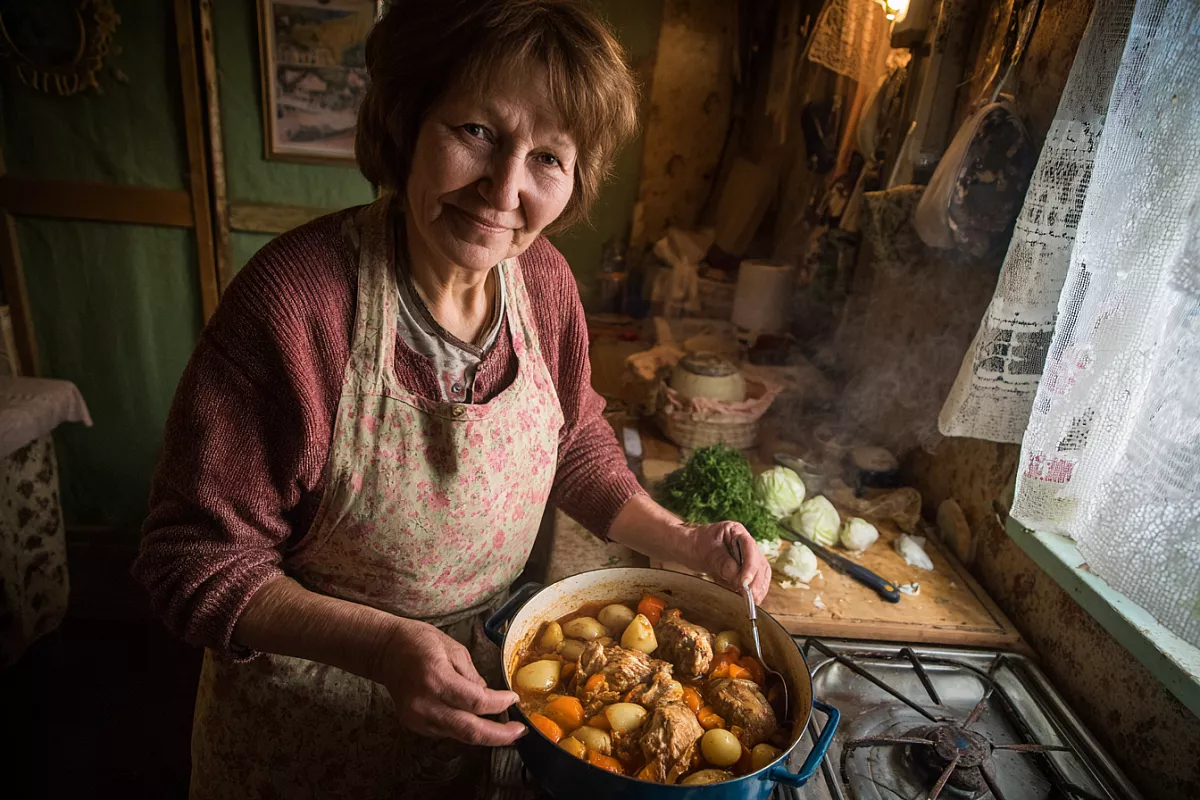 Воды не требуется. Овощи и птица сами отдадут столько сока, что в кастрюле соберётся ароматный бульон. По готовности откройте, вдохните пар и разложите по глубоким тарелкам, стараясь зачерпывать и жидкость, и мягкие слои сразу. Получается честное домашнее рагу без суеты.