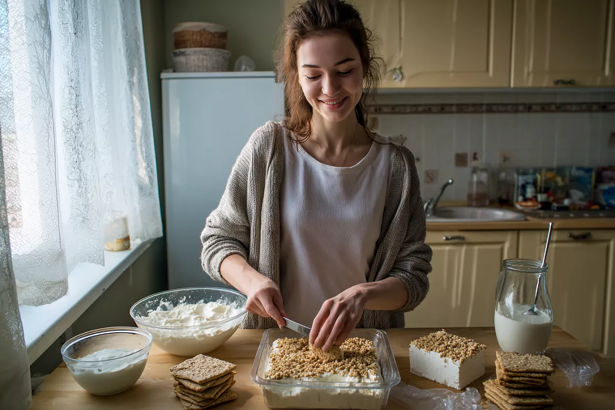 Берите форму, в которой сразу будете подавать. На стол ставлю три миски: молоко для быстрого окунания печенья, творожную массу и ореховую крошку для финала. Если ваш творог плотный, как глазированный сырок, введите молоко порциями до лёгкой, намазываемой консистенции. Масса должна свободно распределяться по печенью, а не рваться.