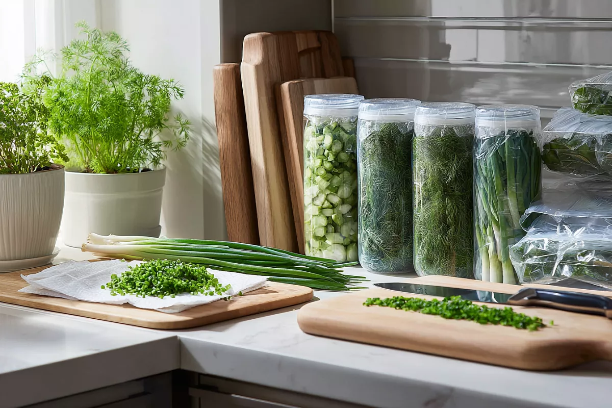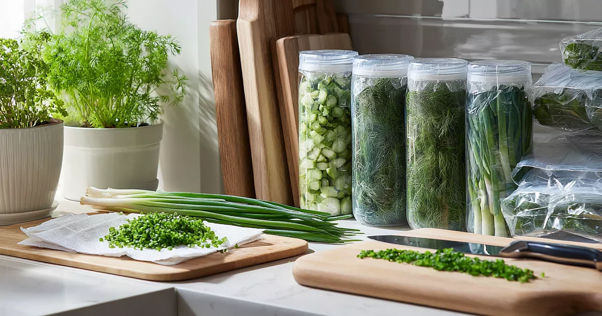 Начнём с подготовки. Укроп, петрушку и зелёный лук моют и раскладывают на бумажные полотенца, чтобы вода ушла. Важный момент для лука звучит без преувеличений: «зелёный лук должен быть абсолютно сухой». Это убережёт перья от льдинок и потери хруста. Укроп и петрушка терпят лёгкую остаточную влагу, но чем суше, тем лучше сохраняется аромат.
