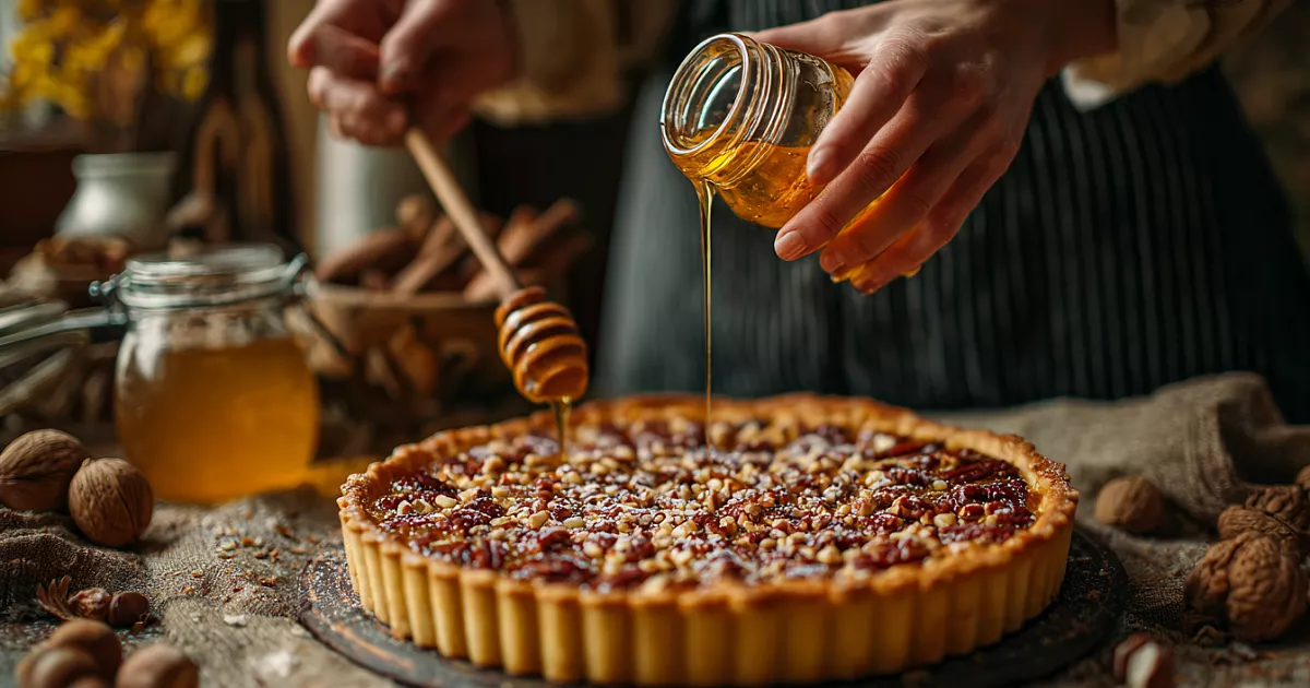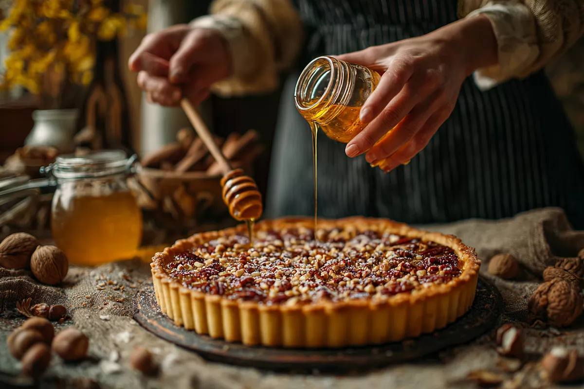 Для начинки взбивают 4 белка с щепоткой соли и 200 г сахара до устойчивых пиков в чистой сухой миске. Измельчают 350 г грецких орехов в блендере до крупной крошки, добавляют в белки с ванилином, корицей и, по желанию, кардамоном, перемешивают. Тесто делят на 4 равные части, раскатывают в тонкие пласты (последний чуть больше). На противень (без смазки) кладут первый пласт, распределяют треть начинки, накрывают вторым пластом, повторяют с начинкой и третьим пластом, затем выкладывают оставшуюся начинку и накрывают последним пластом, защипывая края. Смазывают верх смесью желтка с 1 ст. л. молока, посыпают ореховой крошкой и миндальными лепестками, делают надрезы для выхода пара. Выпекают при 170°C 35–40 минут до готовности внутренних слоев. После выпечки смазывают медом для аромата.