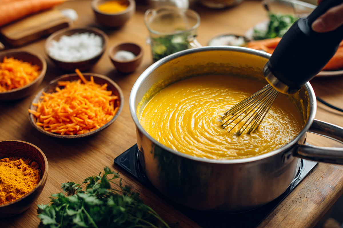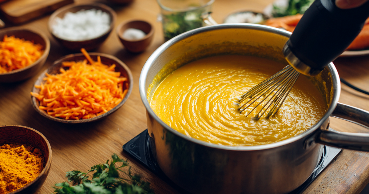 Ускоренная версия — на каждый день. Натрите морковь (так пектин быстрее переходит в отвар), мелко порубите лук и чеснок. Лук с чесноком потушите в ложке оливкового масла 2–3 минуты до мягкости, добавьте морковь, залейте водой и варите на малом огне 20 минут. В скороварке получится ещё быстрее. В конце вмешайте лимонный сок (ускоряет распад пектина) и немного кокосового молока ради кремовой текстуры. По вкусу добавьте щепотки куркумы, карри, мускатного ореха и имбиря, соль и каплю мёда для баланса. Пробейте погружным блендером до нежного крема и дайте супу пару минут «усесться».