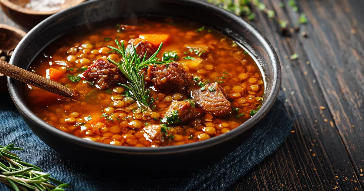 На канале «Время есть!» ведущая делится рецептом густого чечевичного супа с мясом, пропитанного ароматами специй и зелени.