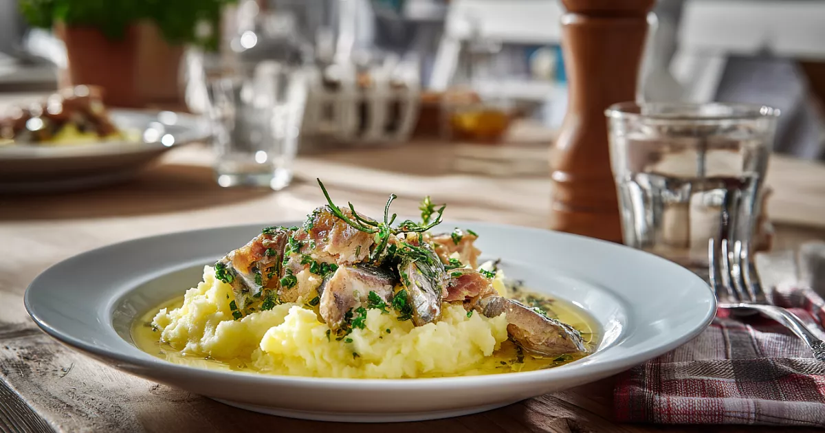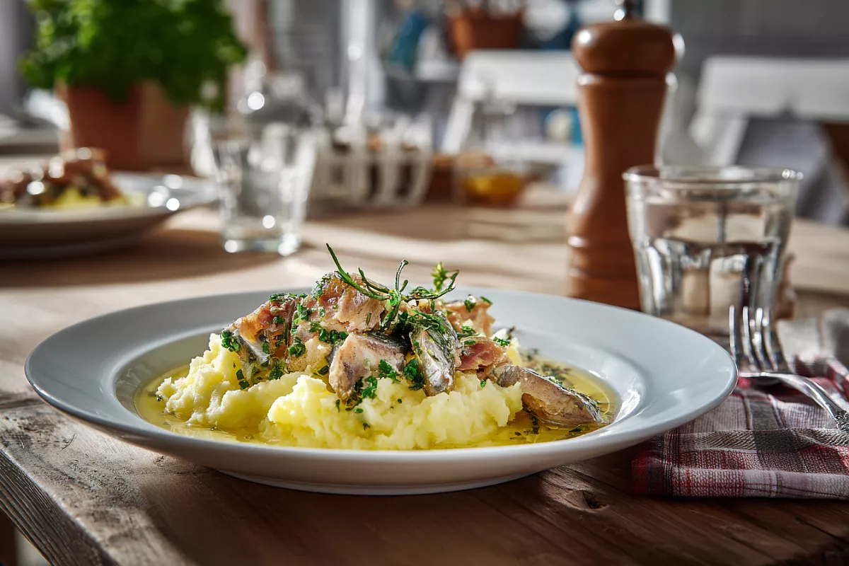 Готовая рыба радует нежной текстурой и лёгкой кислинкой от уксуса. Пюре дополняет блюдо, создавая уютный осенний ужин.