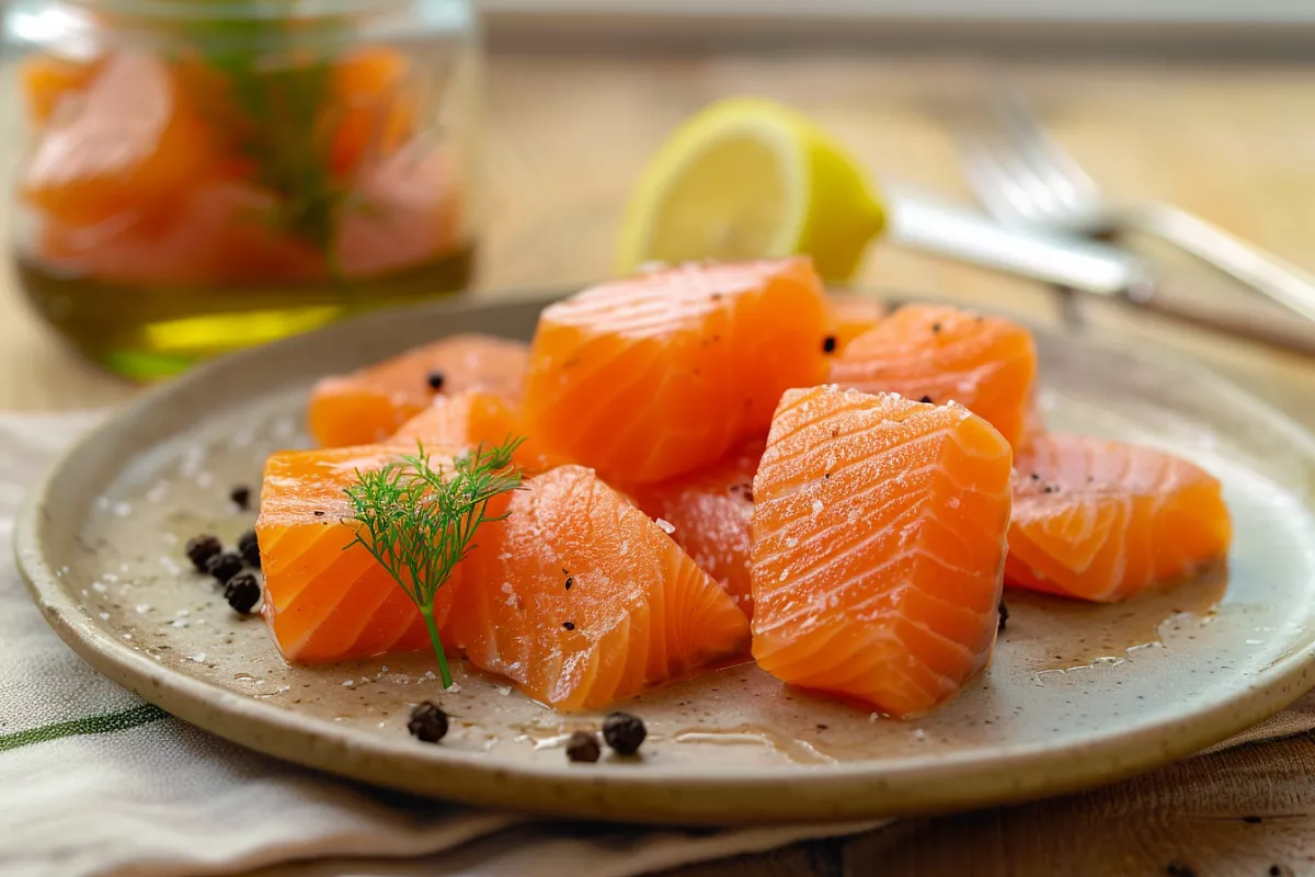 На 1 кг рыбы отмеряют 40 г крупной каменной соли без добавок и 20 г сахара. Смешивают в засолочную смесь и тщательно обваливают/перемешивают филе, чтобы каждый кусок был покрыт равномерно. Такой расчёт даёт стабильную солёность и не позволяет пересолить.