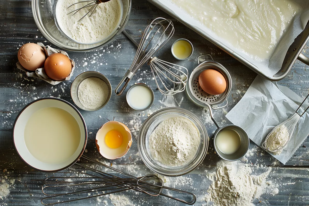 Сухие ингредиенты. Смешайте 2 стакана муки с пакетиком разрыхлителя. Подсыпайте муку порциями в жидкую смесь, каждый раз хорошо промешивая венчиком до гладкости. Важно: не оставляйте комочков. Консистенция — средняя, не густая и не жидкая.